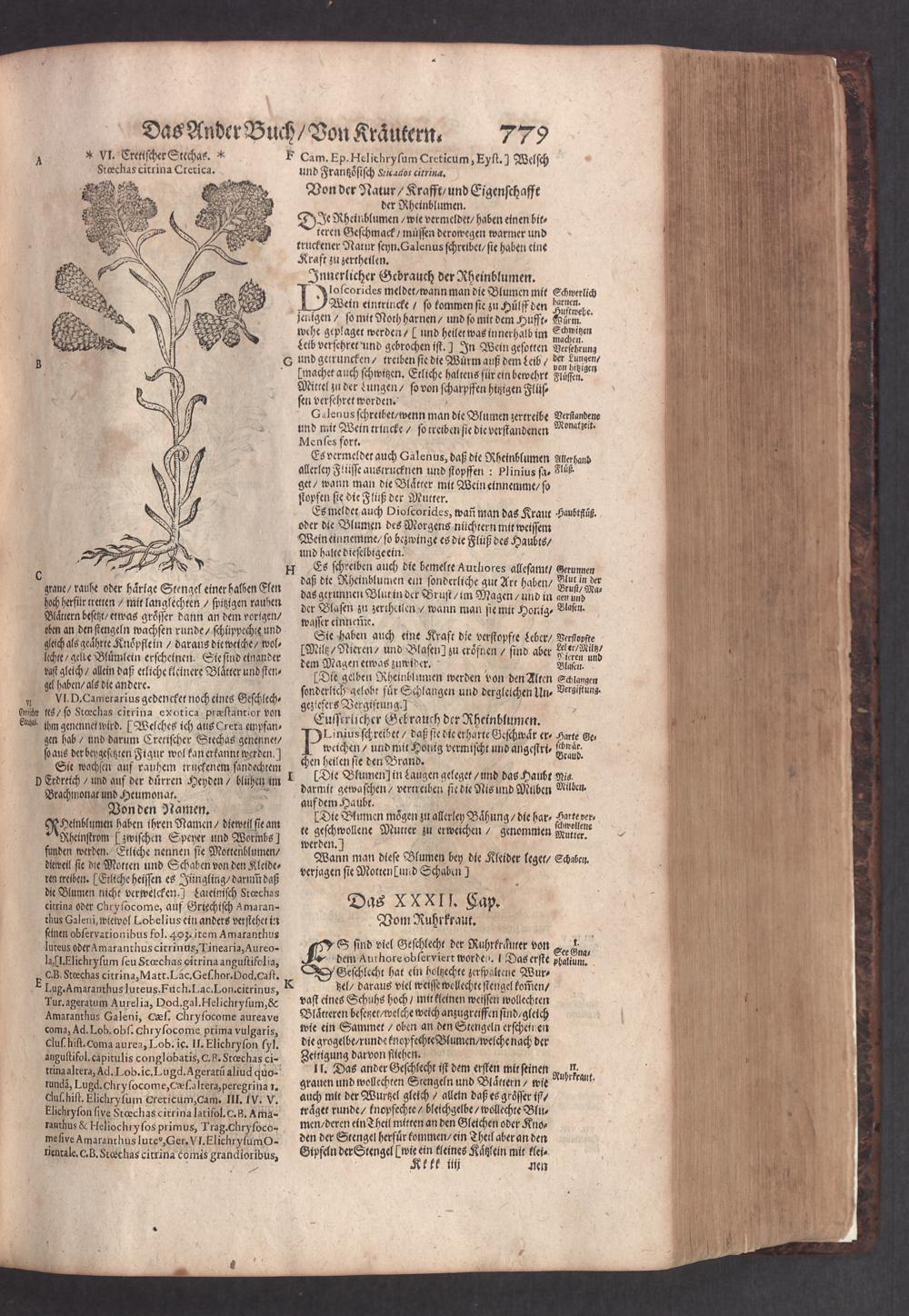 D. Jacobi Theodori Tabernaemontani, Neu vollkommen Kräuter-Buch : Darinnen Uber 3000. Kräuter/ mit schönen und kunstlichen Figuren/ auch deren Underscheid und Würckung/ samt ihren Namen in mancherley Sprachen/ beschrieben: Desgleichen auch/ wie dieselbige in allerhand Kranckheiten/ beyde der Menschen und des Viehs/ sollen angewendet und gebraucht werden/ angezeigt wird. Erstlichen durch Casparum Bauhinum D. und Profess. Basil. mit vielen neuen Figuren/ nutzlichen Artzneyen/ und anderem/ mit sonderem Fleis gebesseret/ Zum Andern Durch Hieronymum Bauhinum D. und Profess. Basil. mit sehr nutzlichen Marginalien, Synonimis, neuen Registeren und anderem vermehrt