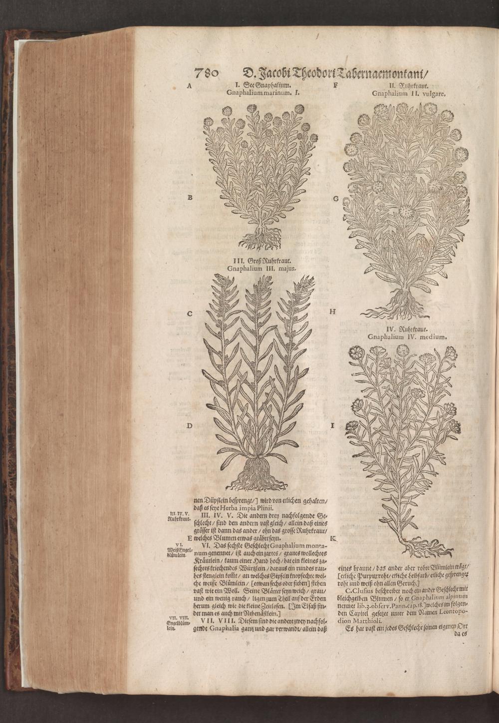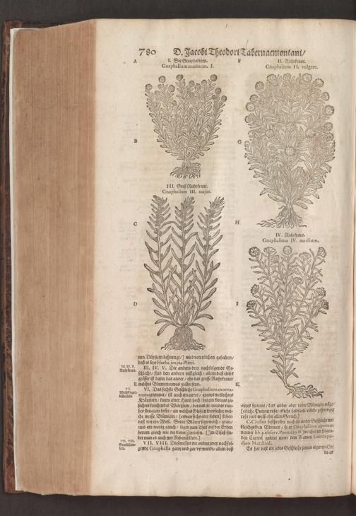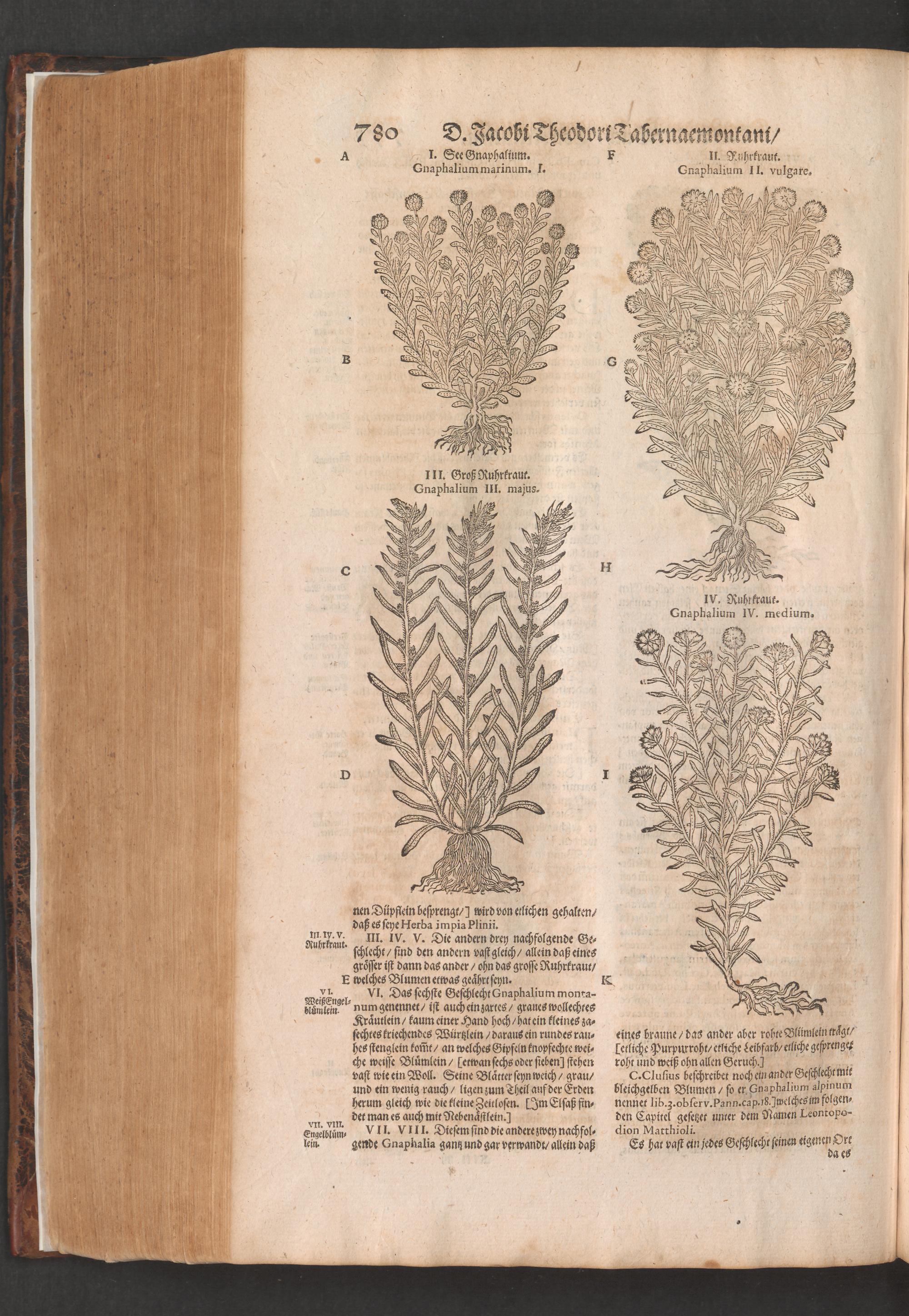 D. Jacobi Theodori Tabernaemontani, Neu vollkommen Kräuter-Buch : Darinnen Uber 3000. Kräuter/ mit schönen und kunstlichen Figuren/ auch deren Underscheid und Würckung/ samt ihren Namen in mancherley Sprachen/ beschrieben: Desgleichen auch/ wie dieselbige in allerhand Kranckheiten/ beyde der Menschen und des Viehs/ sollen angewendet und gebraucht werden/ angezeigt wird. Erstlichen durch Casparum Bauhinum D. und Profess. Basil. mit vielen neuen Figuren/ nutzlichen Artzneyen/ und anderem/ mit sonderem Fleis gebesseret/ Zum Andern Durch Hieronymum Bauhinum D. und Profess. Basil. mit sehr nutzlichen Marginalien, Synonimis, neuen Registeren und anderem vermehrt