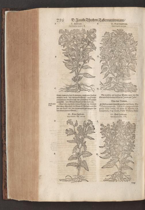 D. Jacobi Theodori Tabernaemontani, Neu vollkommen Kräuter-Buch : Darinnen Uber 3000. Kräuter/ mit schönen und kunstlichen Figuren/ auch deren Underscheid und Würckung/ samt ihren Namen in mancherley Sprachen/ beschrieben: Desgleichen auch/ wie dieselbige in allerhand Kranckheiten/ beyde der Menschen und des Viehs/ sollen angewendet und gebraucht werden/ angezeigt wird. Erstlichen durch Casparum Bauhinum D. und Profess. Basil. mit vielen neuen Figuren/ nutzlichen Artzneyen/ und anderem/ mit sonderem Fleis gebesseret/ Zum Andern Durch Hieronymum Bauhinum D. und Profess. Basil. mit sehr nutzlichen Marginalien, Synonimis, neuen Registeren und anderem vermehrt