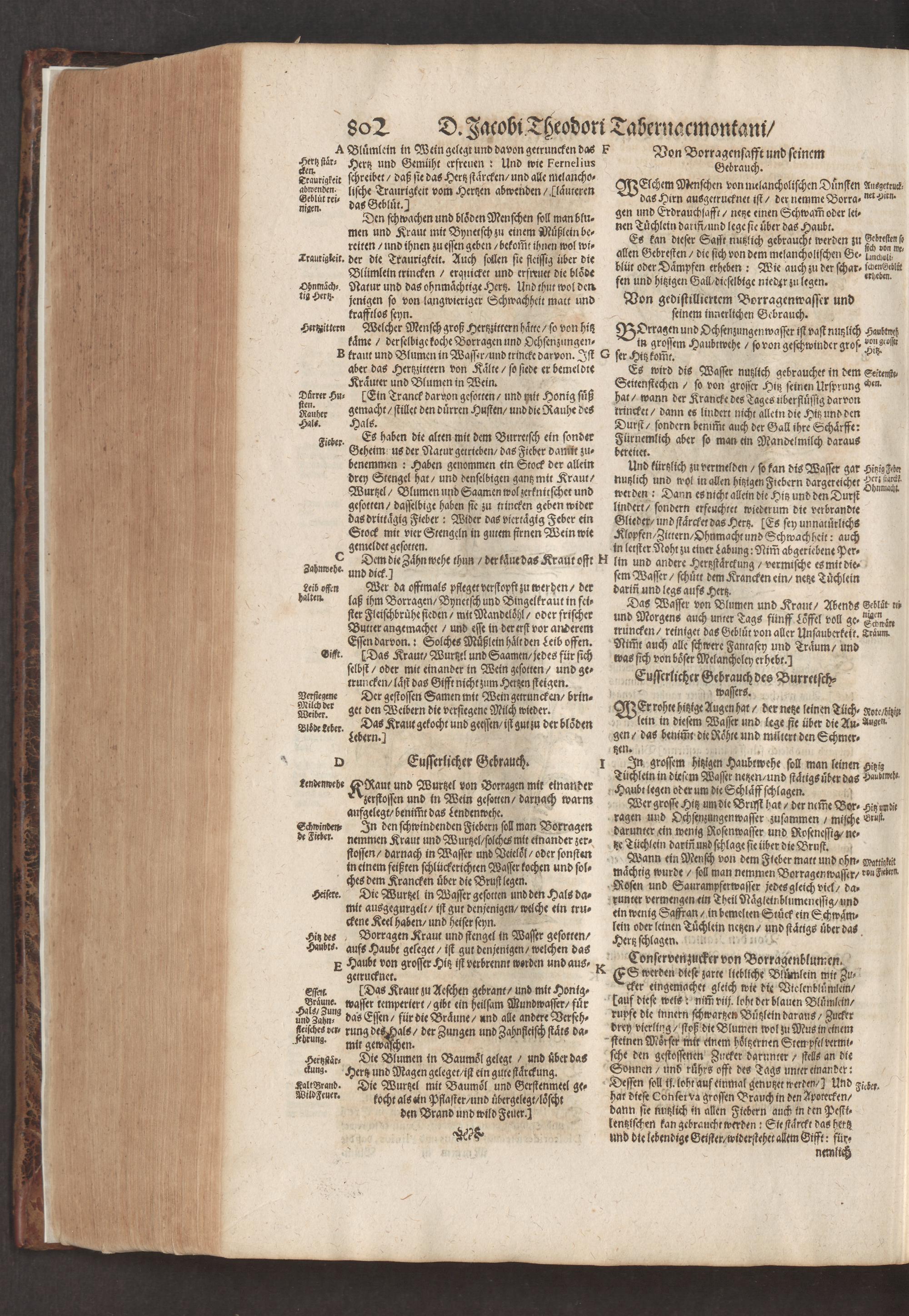 D. Jacobi Theodori Tabernaemontani, Neu vollkommen Kräuter-Buch : Darinnen Uber 3000. Kräuter/ mit schönen und kunstlichen Figuren/ auch deren Underscheid und Würckung/ samt ihren Namen in mancherley Sprachen/ beschrieben: Desgleichen auch/ wie dieselbige in allerhand Kranckheiten/ beyde der Menschen und des Viehs/ sollen angewendet und gebraucht werden/ angezeigt wird. Erstlichen durch Casparum Bauhinum D. und Profess. Basil. mit vielen neuen Figuren/ nutzlichen Artzneyen/ und anderem/ mit sonderem Fleis gebesseret/ Zum Andern Durch Hieronymum Bauhinum D. und Profess. Basil. mit sehr nutzlichen Marginalien, Synonimis, neuen Registeren und anderem vermehrt