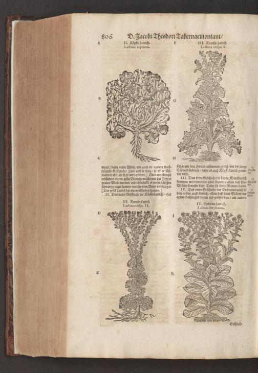 D. Jacobi Theodori Tabernaemontani, Neu vollkommen Kräuter-Buch : Darinnen Uber 3000. Kräuter/ mit schönen und kunstlichen Figuren/ auch deren Underscheid und Würckung/ samt ihren Namen in mancherley Sprachen/ beschrieben: Desgleichen auch/ wie dieselbige in allerhand Kranckheiten/ beyde der Menschen und des Viehs/ sollen angewendet und gebraucht werden/ angezeigt wird. Erstlichen durch Casparum Bauhinum D. und Profess. Basil. mit vielen neuen Figuren/ nutzlichen Artzneyen/ und anderem/ mit sonderem Fleis gebesseret/ Zum Andern Durch Hieronymum Bauhinum D. und Profess. Basil. mit sehr nutzlichen Marginalien, Synonimis, neuen Registeren und anderem vermehrt