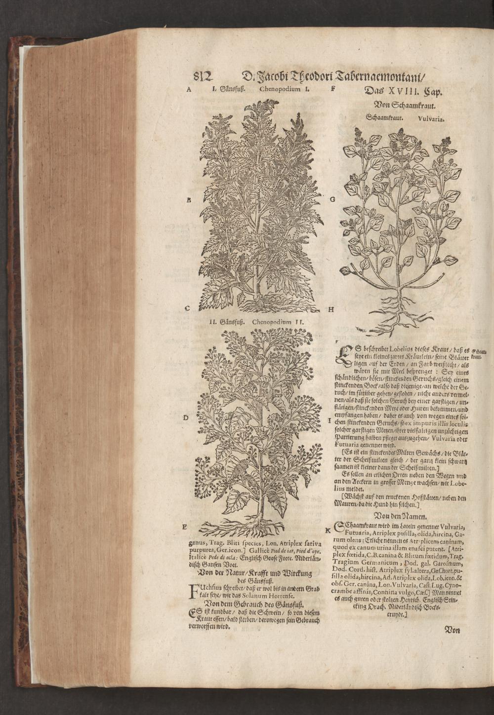 D. Jacobi Theodori Tabernaemontani, Neu vollkommen Kräuter-Buch : Darinnen Uber 3000. Kräuter/ mit schönen und kunstlichen Figuren/ auch deren Underscheid und Würckung/ samt ihren Namen in mancherley Sprachen/ beschrieben: Desgleichen auch/ wie dieselbige in allerhand Kranckheiten/ beyde der Menschen und des Viehs/ sollen angewendet und gebraucht werden/ angezeigt wird. Erstlichen durch Casparum Bauhinum D. und Profess. Basil. mit vielen neuen Figuren/ nutzlichen Artzneyen/ und anderem/ mit sonderem Fleis gebesseret/ Zum Andern Durch Hieronymum Bauhinum D. und Profess. Basil. mit sehr nutzlichen Marginalien, Synonimis, neuen Registeren und anderem vermehrt