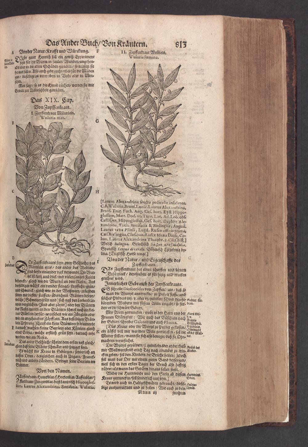 D. Jacobi Theodori Tabernaemontani, Neu vollkommen Kräuter-Buch : Darinnen Uber 3000. Kräuter/ mit schönen und kunstlichen Figuren/ auch deren Underscheid und Würckung/ samt ihren Namen in mancherley Sprachen/ beschrieben: Desgleichen auch/ wie dieselbige in allerhand Kranckheiten/ beyde der Menschen und des Viehs/ sollen angewendet und gebraucht werden/ angezeigt wird. Erstlichen durch Casparum Bauhinum D. und Profess. Basil. mit vielen neuen Figuren/ nutzlichen Artzneyen/ und anderem/ mit sonderem Fleis gebesseret/ Zum Andern Durch Hieronymum Bauhinum D. und Profess. Basil. mit sehr nutzlichen Marginalien, Synonimis, neuen Registeren und anderem vermehrt