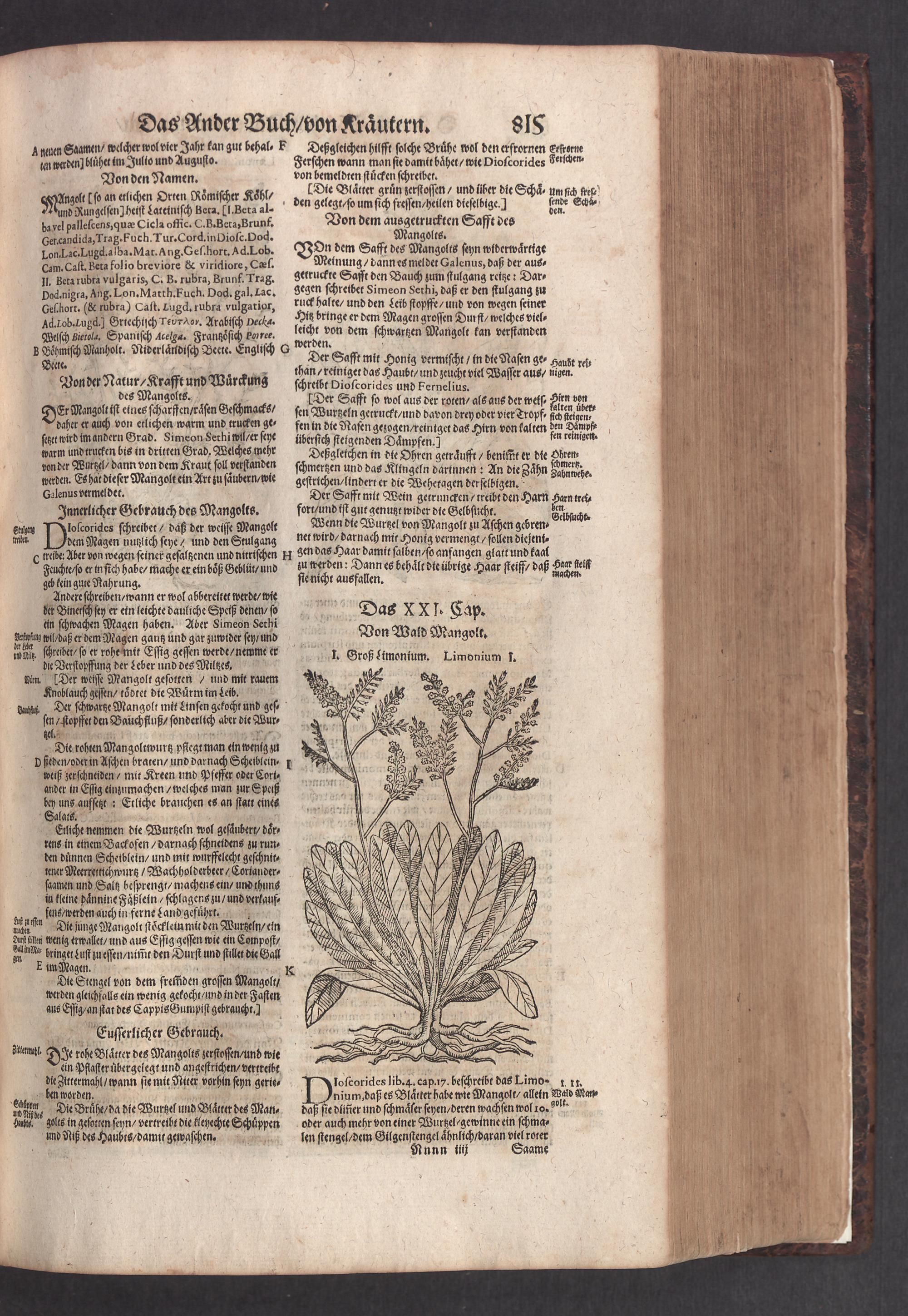 D. Jacobi Theodori Tabernaemontani, Neu vollkommen Kräuter-Buch : Darinnen Uber 3000. Kräuter/ mit schönen und kunstlichen Figuren/ auch deren Underscheid und Würckung/ samt ihren Namen in mancherley Sprachen/ beschrieben: Desgleichen auch/ wie dieselbige in allerhand Kranckheiten/ beyde der Menschen und des Viehs/ sollen angewendet und gebraucht werden/ angezeigt wird. Erstlichen durch Casparum Bauhinum D. und Profess. Basil. mit vielen neuen Figuren/ nutzlichen Artzneyen/ und anderem/ mit sonderem Fleis gebesseret/ Zum Andern Durch Hieronymum Bauhinum D. und Profess. Basil. mit sehr nutzlichen Marginalien, Synonimis, neuen Registeren und anderem vermehrt