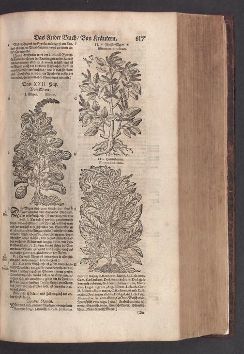 D. Jacobi Theodori Tabernaemontani, Neu vollkommen Kräuter-Buch : Darinnen Uber 3000. Kräuter/ mit schönen und kunstlichen Figuren/ auch deren Underscheid und Würckung/ samt ihren Namen in mancherley Sprachen/ beschrieben: Desgleichen auch/ wie dieselbige in allerhand Kranckheiten/ beyde der Menschen und des Viehs/ sollen angewendet und gebraucht werden/ angezeigt wird. Erstlichen durch Casparum Bauhinum D. und Profess. Basil. mit vielen neuen Figuren/ nutzlichen Artzneyen/ und anderem/ mit sonderem Fleis gebesseret/ Zum Andern Durch Hieronymum Bauhinum D. und Profess. Basil. mit sehr nutzlichen Marginalien, Synonimis, neuen Registeren und anderem vermehrt