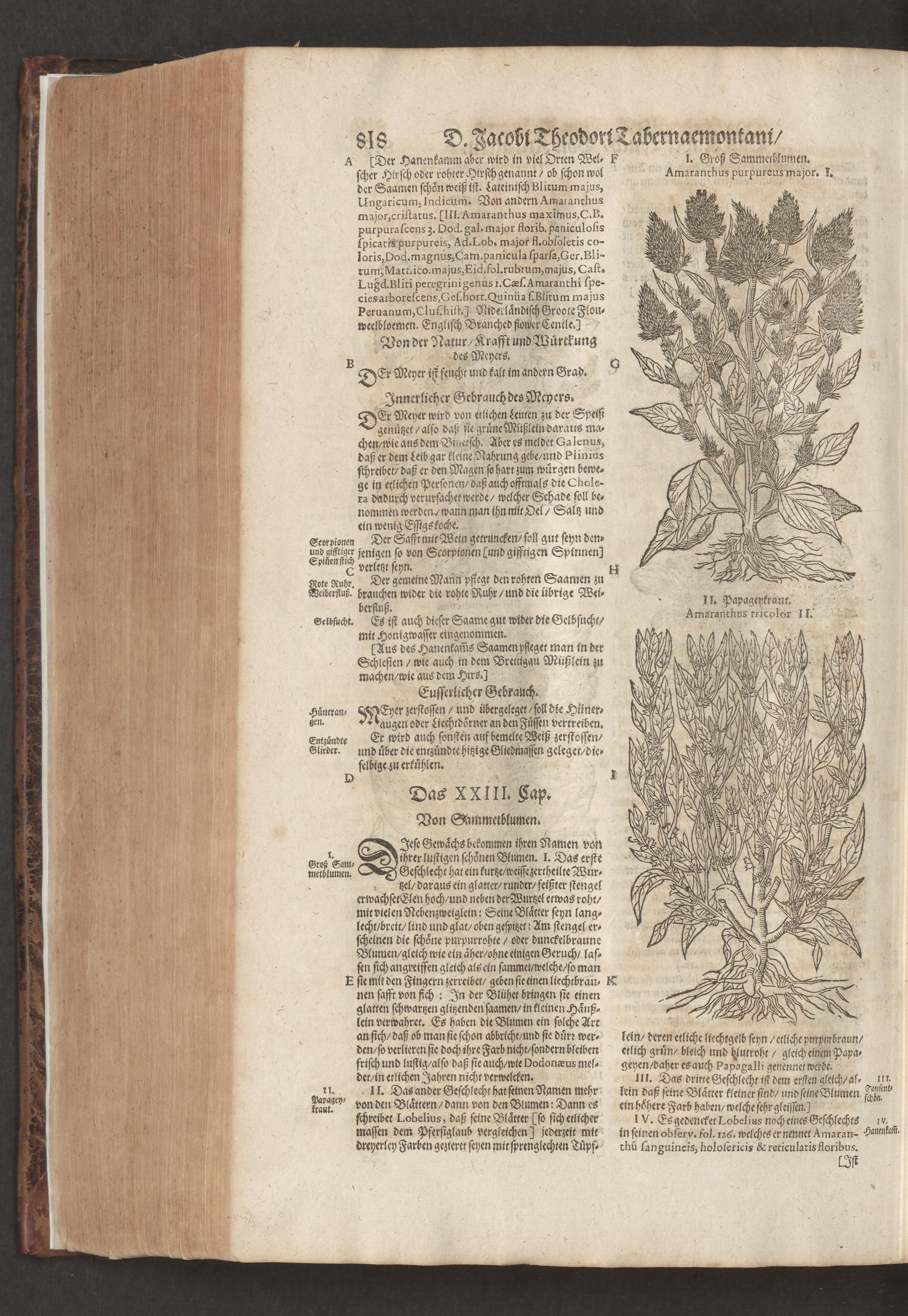 D. Jacobi Theodori Tabernaemontani, Neu vollkommen Kräuter-Buch : Darinnen Uber 3000. Kräuter/ mit schönen und kunstlichen Figuren/ auch deren Underscheid und Würckung/ samt ihren Namen in mancherley Sprachen/ beschrieben: Desgleichen auch/ wie dieselbige in allerhand Kranckheiten/ beyde der Menschen und des Viehs/ sollen angewendet und gebraucht werden/ angezeigt wird. Erstlichen durch Casparum Bauhinum D. und Profess. Basil. mit vielen neuen Figuren/ nutzlichen Artzneyen/ und anderem/ mit sonderem Fleis gebesseret/ Zum Andern Durch Hieronymum Bauhinum D. und Profess. Basil. mit sehr nutzlichen Marginalien, Synonimis, neuen Registeren und anderem vermehrt