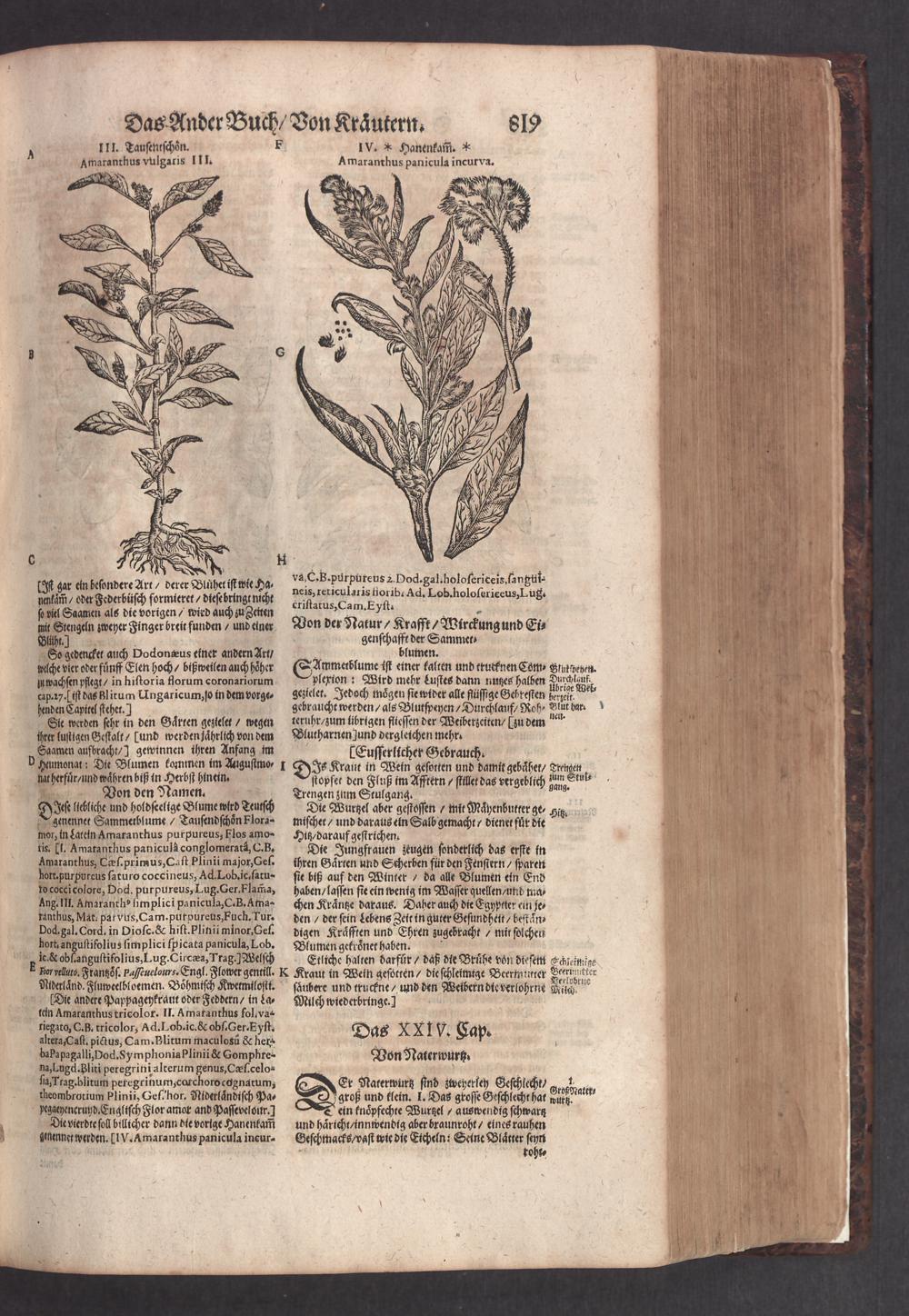 D. Jacobi Theodori Tabernaemontani, Neu vollkommen Kräuter-Buch : Darinnen Uber 3000. Kräuter/ mit schönen und kunstlichen Figuren/ auch deren Underscheid und Würckung/ samt ihren Namen in mancherley Sprachen/ beschrieben: Desgleichen auch/ wie dieselbige in allerhand Kranckheiten/ beyde der Menschen und des Viehs/ sollen angewendet und gebraucht werden/ angezeigt wird. Erstlichen durch Casparum Bauhinum D. und Profess. Basil. mit vielen neuen Figuren/ nutzlichen Artzneyen/ und anderem/ mit sonderem Fleis gebesseret/ Zum Andern Durch Hieronymum Bauhinum D. und Profess. Basil. mit sehr nutzlichen Marginalien, Synonimis, neuen Registeren und anderem vermehrt