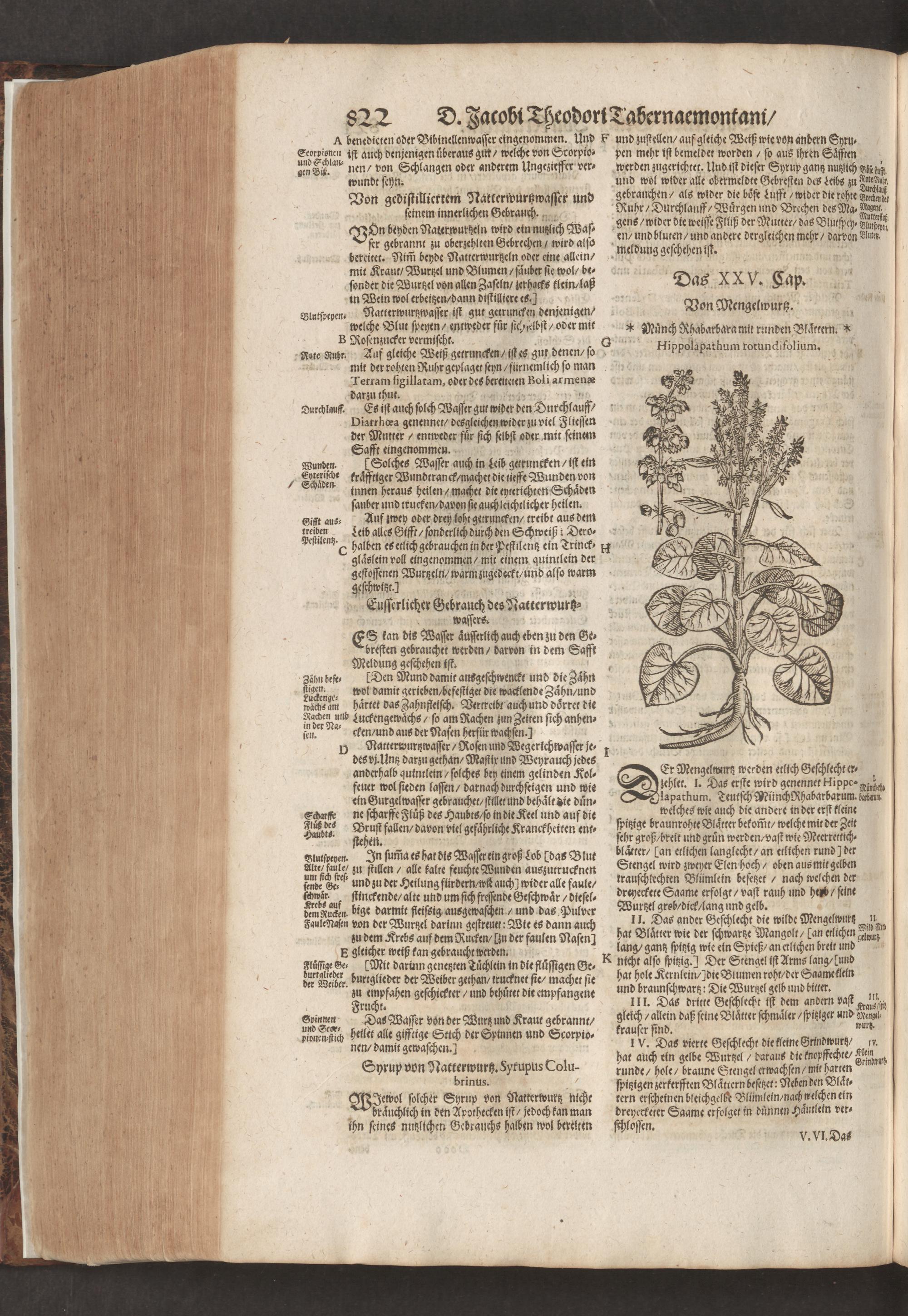D. Jacobi Theodori Tabernaemontani, Neu vollkommen Kräuter-Buch : Darinnen Uber 3000. Kräuter/ mit schönen und kunstlichen Figuren/ auch deren Underscheid und Würckung/ samt ihren Namen in mancherley Sprachen/ beschrieben: Desgleichen auch/ wie dieselbige in allerhand Kranckheiten/ beyde der Menschen und des Viehs/ sollen angewendet und gebraucht werden/ angezeigt wird. Erstlichen durch Casparum Bauhinum D. und Profess. Basil. mit vielen neuen Figuren/ nutzlichen Artzneyen/ und anderem/ mit sonderem Fleis gebesseret/ Zum Andern Durch Hieronymum Bauhinum D. und Profess. Basil. mit sehr nutzlichen Marginalien, Synonimis, neuen Registeren und anderem vermehrt