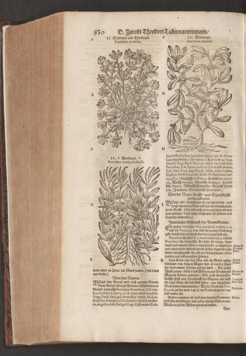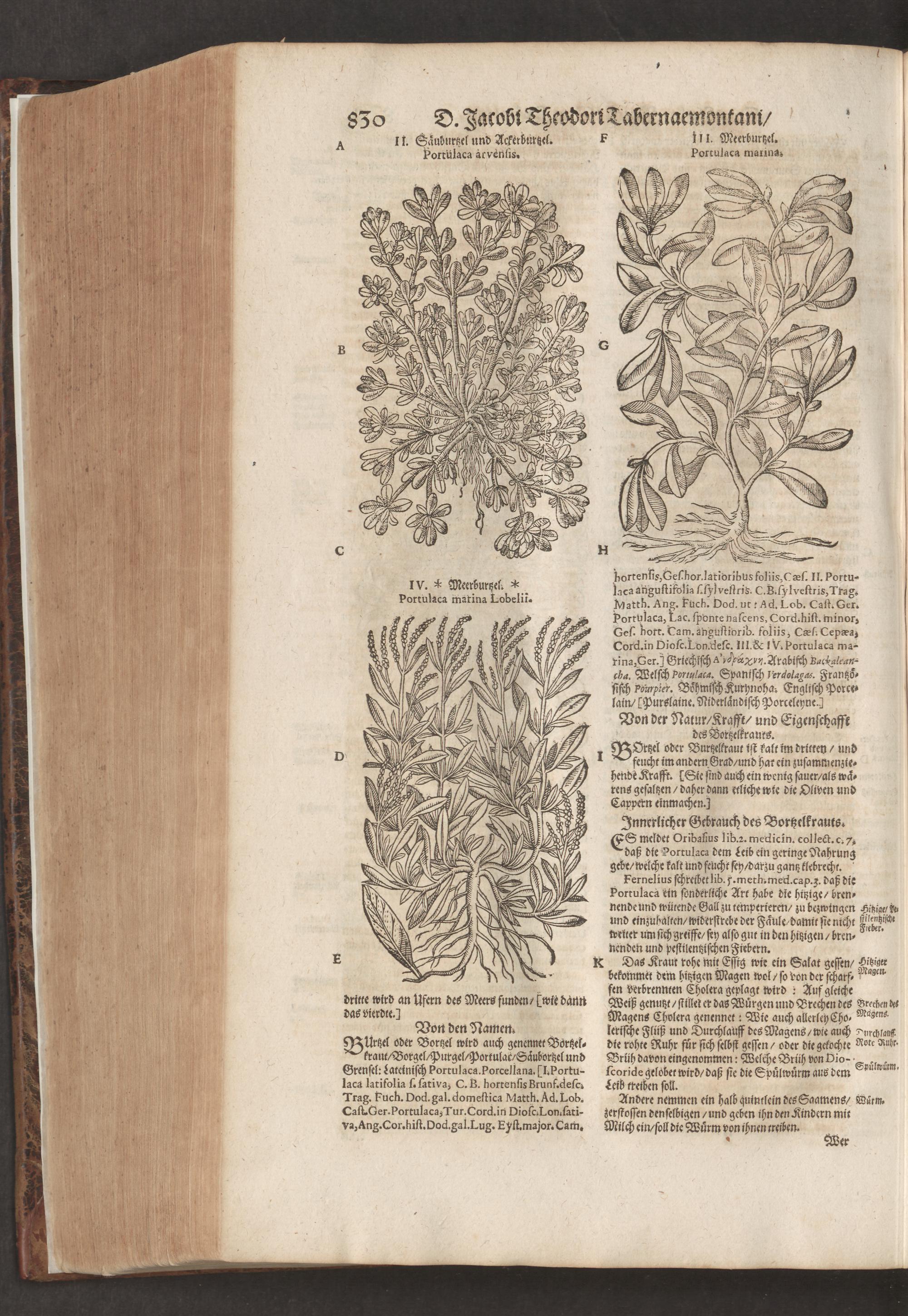 D. Jacobi Theodori Tabernaemontani, Neu vollkommen Kräuter-Buch : Darinnen Uber 3000. Kräuter/ mit schönen und kunstlichen Figuren/ auch deren Underscheid und Würckung/ samt ihren Namen in mancherley Sprachen/ beschrieben: Desgleichen auch/ wie dieselbige in allerhand Kranckheiten/ beyde der Menschen und des Viehs/ sollen angewendet und gebraucht werden/ angezeigt wird. Erstlichen durch Casparum Bauhinum D. und Profess. Basil. mit vielen neuen Figuren/ nutzlichen Artzneyen/ und anderem/ mit sonderem Fleis gebesseret/ Zum Andern Durch Hieronymum Bauhinum D. und Profess. Basil. mit sehr nutzlichen Marginalien, Synonimis, neuen Registeren und anderem vermehrt