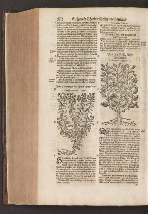 D. Jacobi Theodori Tabernaemontani, Neu vollkommen Kräuter-Buch : Darinnen Uber 3000. Kräuter/ mit schönen und kunstlichen Figuren/ auch deren Underscheid und Würckung/ samt ihren Namen in mancherley Sprachen/ beschrieben: Desgleichen auch/ wie dieselbige in allerhand Kranckheiten/ beyde der Menschen und des Viehs/ sollen angewendet und gebraucht werden/ angezeigt wird. Erstlichen durch Casparum Bauhinum D. und Profess. Basil. mit vielen neuen Figuren/ nutzlichen Artzneyen/ und anderem/ mit sonderem Fleis gebesseret/ Zum Andern Durch Hieronymum Bauhinum D. und Profess. Basil. mit sehr nutzlichen Marginalien, Synonimis, neuen Registeren und anderem vermehrt