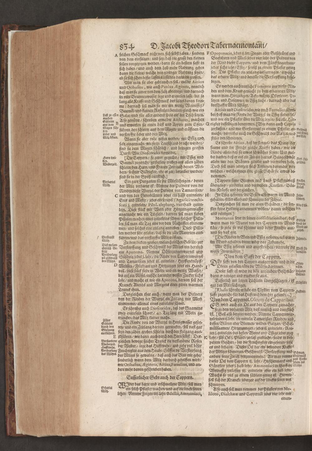 D. Jacobi Theodori Tabernaemontani, Neu vollkommen Kräuter-Buch : Darinnen Uber 3000. Kräuter/ mit schönen und kunstlichen Figuren/ auch deren Underscheid und Würckung/ samt ihren Namen in mancherley Sprachen/ beschrieben: Desgleichen auch/ wie dieselbige in allerhand Kranckheiten/ beyde der Menschen und des Viehs/ sollen angewendet und gebraucht werden/ angezeigt wird. Erstlichen durch Casparum Bauhinum D. und Profess. Basil. mit vielen neuen Figuren/ nutzlichen Artzneyen/ und anderem/ mit sonderem Fleis gebesseret/ Zum Andern Durch Hieronymum Bauhinum D. und Profess. Basil. mit sehr nutzlichen Marginalien, Synonimis, neuen Registeren und anderem vermehrt