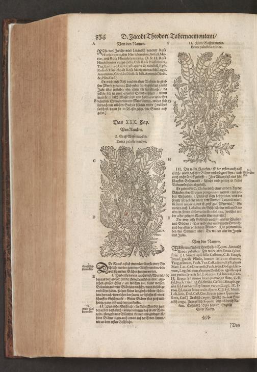D. Jacobi Theodori Tabernaemontani, Neu vollkommen Kräuter-Buch : Darinnen Uber 3000. Kräuter/ mit schönen und kunstlichen Figuren/ auch deren Underscheid und Würckung/ samt ihren Namen in mancherley Sprachen/ beschrieben: Desgleichen auch/ wie dieselbige in allerhand Kranckheiten/ beyde der Menschen und des Viehs/ sollen angewendet und gebraucht werden/ angezeigt wird. Erstlichen durch Casparum Bauhinum D. und Profess. Basil. mit vielen neuen Figuren/ nutzlichen Artzneyen/ und anderem/ mit sonderem Fleis gebesseret/ Zum Andern Durch Hieronymum Bauhinum D. und Profess. Basil. mit sehr nutzlichen Marginalien, Synonimis, neuen Registeren und anderem vermehrt