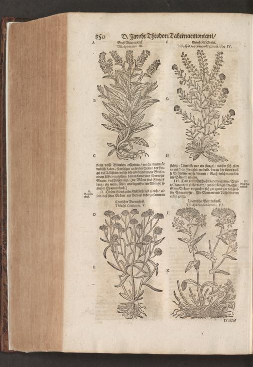 D. Jacobi Theodori Tabernaemontani, Neu vollkommen Kräuter-Buch : Darinnen Uber 3000. Kräuter/ mit schönen und kunstlichen Figuren/ auch deren Underscheid und Würckung/ samt ihren Namen in mancherley Sprachen/ beschrieben: Desgleichen auch/ wie dieselbige in allerhand Kranckheiten/ beyde der Menschen und des Viehs/ sollen angewendet und gebraucht werden/ angezeigt wird. Erstlichen durch Casparum Bauhinum D. und Profess. Basil. mit vielen neuen Figuren/ nutzlichen Artzneyen/ und anderem/ mit sonderem Fleis gebesseret/ Zum Andern Durch Hieronymum Bauhinum D. und Profess. Basil. mit sehr nutzlichen Marginalien, Synonimis, neuen Registeren und anderem vermehrt