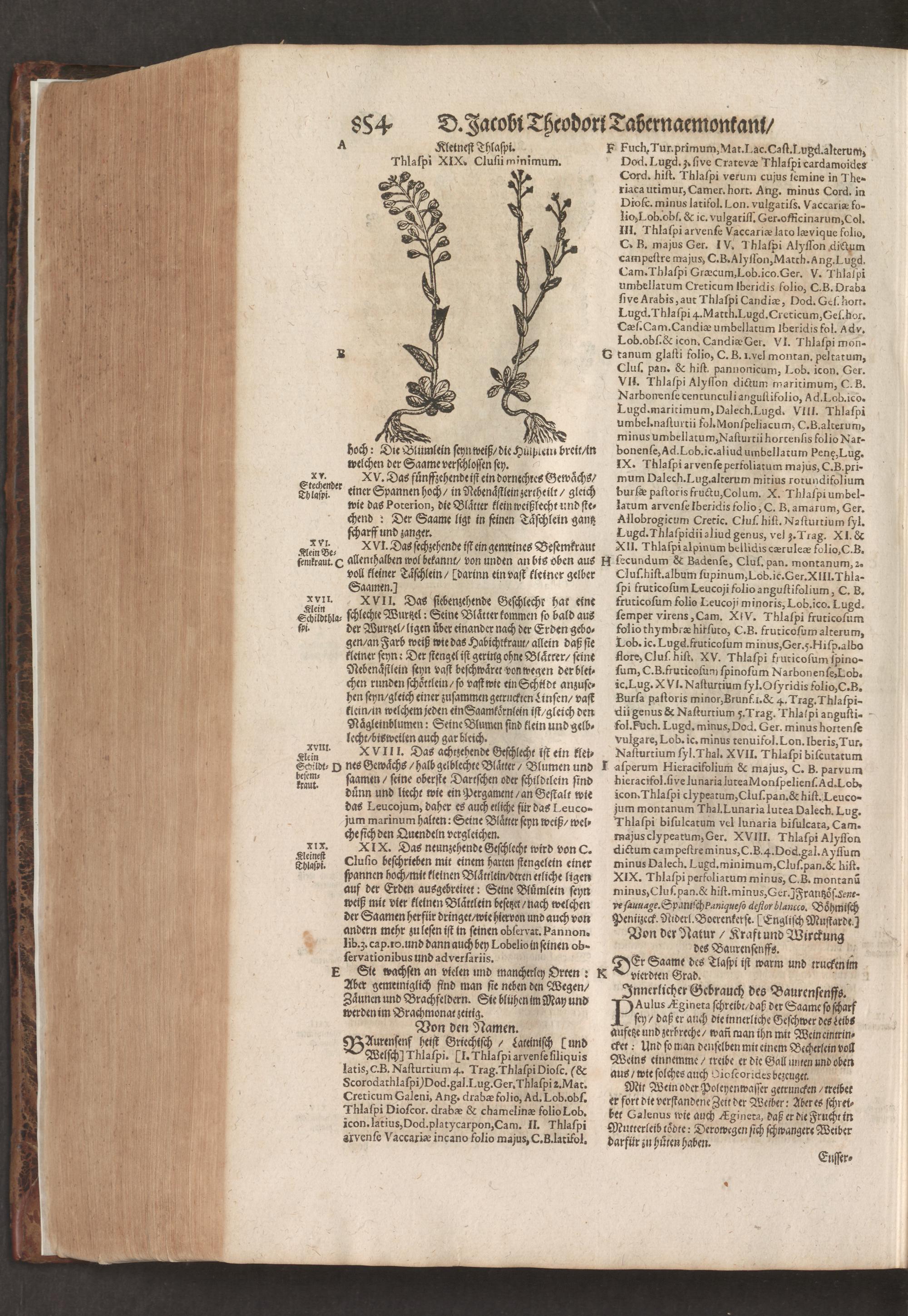 D. Jacobi Theodori Tabernaemontani, Neu vollkommen Kräuter-Buch : Darinnen Uber 3000. Kräuter/ mit schönen und kunstlichen Figuren/ auch deren Underscheid und Würckung/ samt ihren Namen in mancherley Sprachen/ beschrieben: Desgleichen auch/ wie dieselbige in allerhand Kranckheiten/ beyde der Menschen und des Viehs/ sollen angewendet und gebraucht werden/ angezeigt wird. Erstlichen durch Casparum Bauhinum D. und Profess. Basil. mit vielen neuen Figuren/ nutzlichen Artzneyen/ und anderem/ mit sonderem Fleis gebesseret/ Zum Andern Durch Hieronymum Bauhinum D. und Profess. Basil. mit sehr nutzlichen Marginalien, Synonimis, neuen Registeren und anderem vermehrt