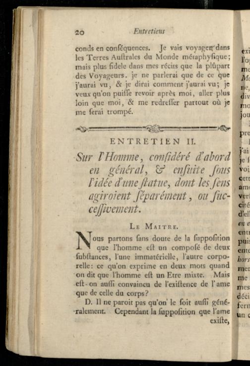 Entretien II. Sur l'Homme, confidéré d'abord en général, et ensuite sous l'idée d'une statue, dont les sens agiroient séparément, ou successivement.