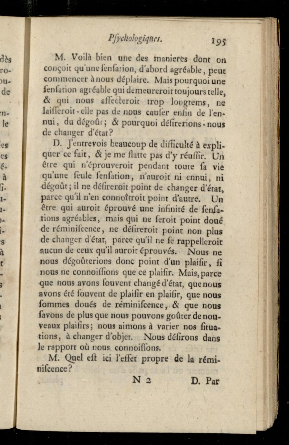 Entretien VI. Confidérations sur la réminiscence, sur la naissance de l'habitude, sur le plaisir attaché a la nouveauté, et sur la personalité.