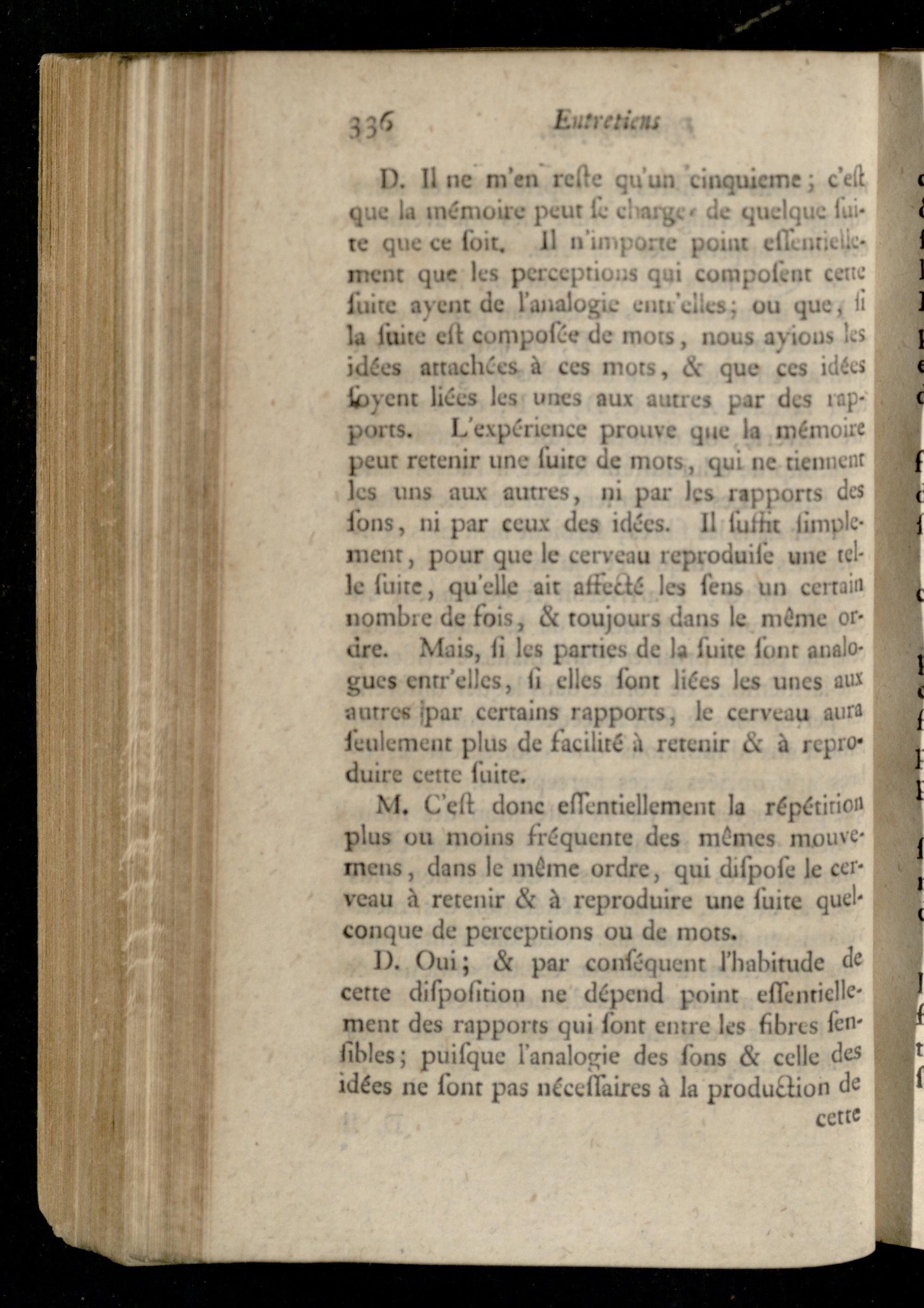 Entretien VI. Confidérations sur la réminiscence, sur la naissance de l'habitude, sur le plaisir attaché a la nouveauté, et sur la personalité.