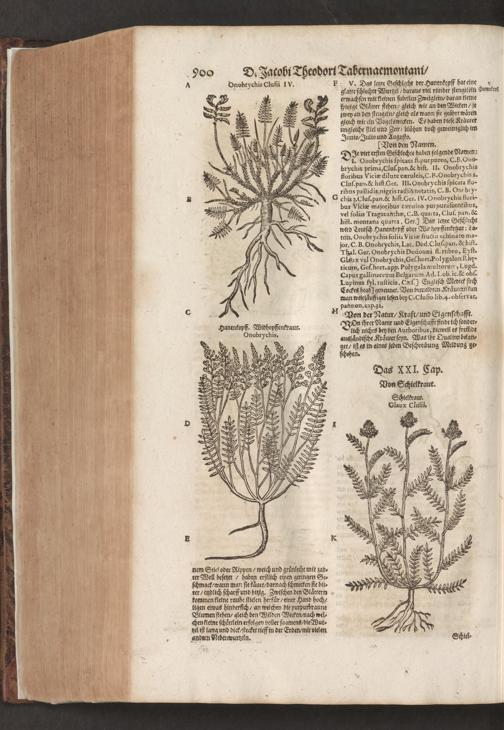 D. Jacobi Theodori Tabernaemontani, Neu vollkommen Kräuter-Buch : Darinnen Uber 3000. Kräuter/ mit schönen und kunstlichen Figuren/ auch deren Underscheid und Würckung/ samt ihren Namen in mancherley Sprachen/ beschrieben: Desgleichen auch/ wie dieselbige in allerhand Kranckheiten/ beyde der Menschen und des Viehs/ sollen angewendet und gebraucht werden/ angezeigt wird. Erstlichen durch Casparum Bauhinum D. und Profess. Basil. mit vielen neuen Figuren/ nutzlichen Artzneyen/ und anderem/ mit sonderem Fleis gebesseret/ Zum Andern Durch Hieronymum Bauhinum D. und Profess. Basil. mit sehr nutzlichen Marginalien, Synonimis, neuen Registeren und anderem vermehrt