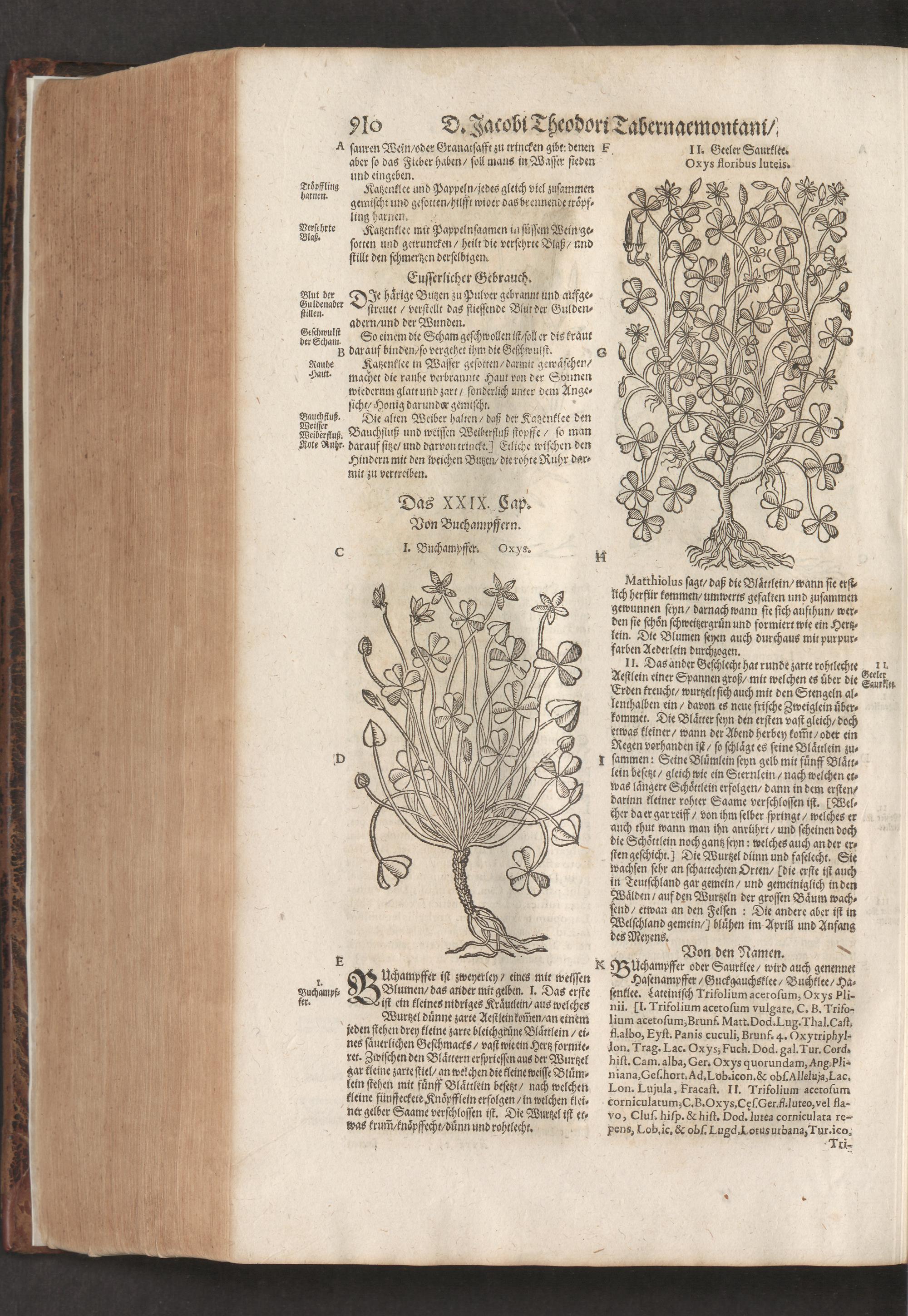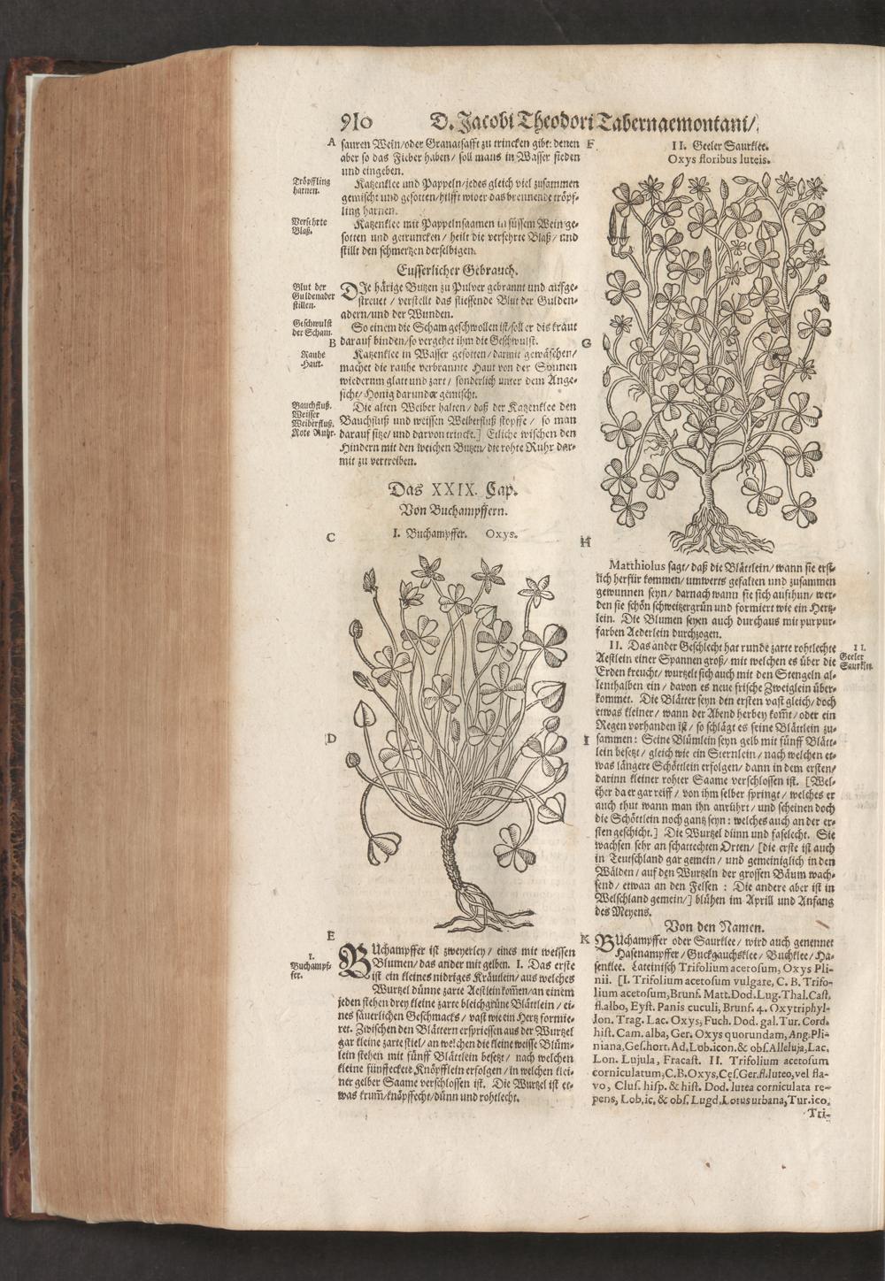 D. Jacobi Theodori Tabernaemontani, Neu vollkommen Kräuter-Buch : Darinnen Uber 3000. Kräuter/ mit schönen und kunstlichen Figuren/ auch deren Underscheid und Würckung/ samt ihren Namen in mancherley Sprachen/ beschrieben: Desgleichen auch/ wie dieselbige in allerhand Kranckheiten/ beyde der Menschen und des Viehs/ sollen angewendet und gebraucht werden/ angezeigt wird. Erstlichen durch Casparum Bauhinum D. und Profess. Basil. mit vielen neuen Figuren/ nutzlichen Artzneyen/ und anderem/ mit sonderem Fleis gebesseret/ Zum Andern Durch Hieronymum Bauhinum D. und Profess. Basil. mit sehr nutzlichen Marginalien, Synonimis, neuen Registeren und anderem vermehrt