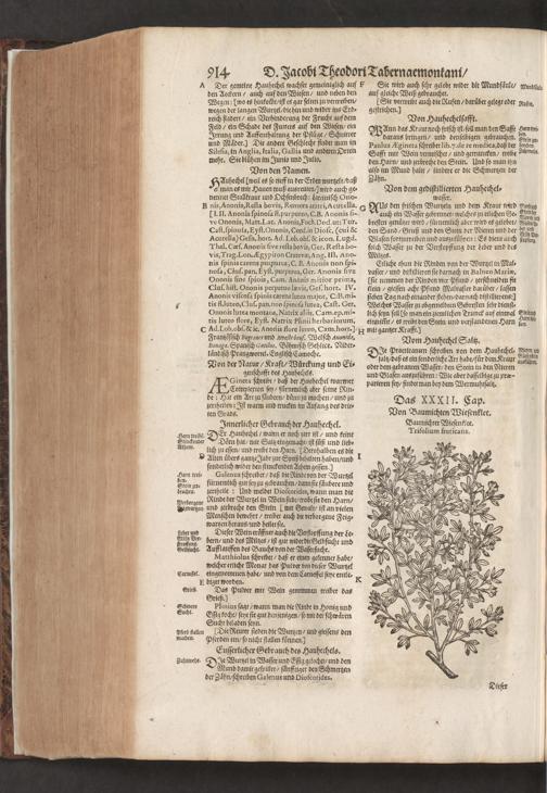 D. Jacobi Theodori Tabernaemontani, Neu vollkommen Kräuter-Buch : Darinnen Uber 3000. Kräuter/ mit schönen und kunstlichen Figuren/ auch deren Underscheid und Würckung/ samt ihren Namen in mancherley Sprachen/ beschrieben: Desgleichen auch/ wie dieselbige in allerhand Kranckheiten/ beyde der Menschen und des Viehs/ sollen angewendet und gebraucht werden/ angezeigt wird. Erstlichen durch Casparum Bauhinum D. und Profess. Basil. mit vielen neuen Figuren/ nutzlichen Artzneyen/ und anderem/ mit sonderem Fleis gebesseret/ Zum Andern Durch Hieronymum Bauhinum D. und Profess. Basil. mit sehr nutzlichen Marginalien, Synonimis, neuen Registeren und anderem vermehrt