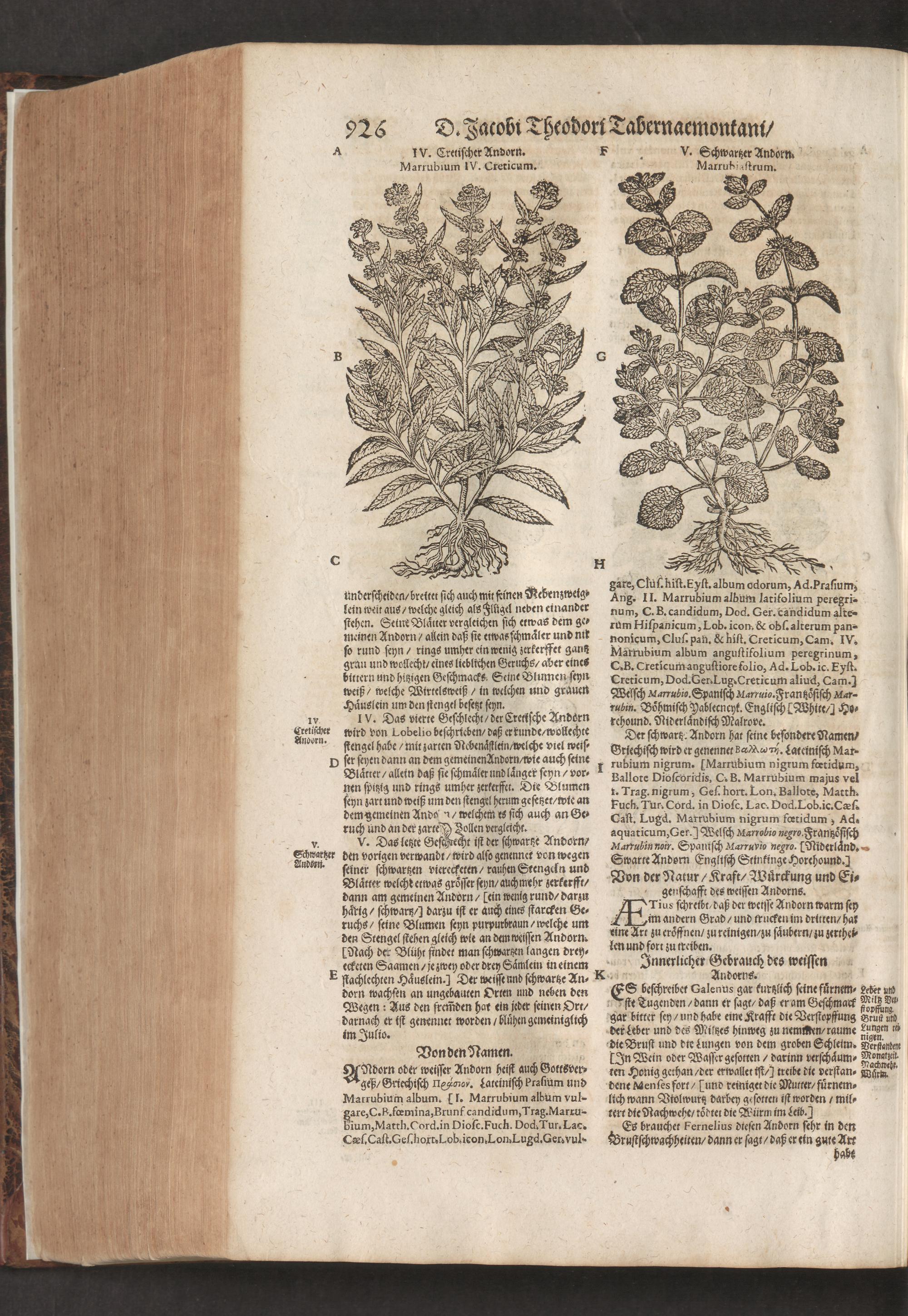D. Jacobi Theodori Tabernaemontani, Neu vollkommen Kräuter-Buch : Darinnen Uber 3000. Kräuter/ mit schönen und kunstlichen Figuren/ auch deren Underscheid und Würckung/ samt ihren Namen in mancherley Sprachen/ beschrieben: Desgleichen auch/ wie dieselbige in allerhand Kranckheiten/ beyde der Menschen und des Viehs/ sollen angewendet und gebraucht werden/ angezeigt wird. Erstlichen durch Casparum Bauhinum D. und Profess. Basil. mit vielen neuen Figuren/ nutzlichen Artzneyen/ und anderem/ mit sonderem Fleis gebesseret/ Zum Andern Durch Hieronymum Bauhinum D. und Profess. Basil. mit sehr nutzlichen Marginalien, Synonimis, neuen Registeren und anderem vermehrt