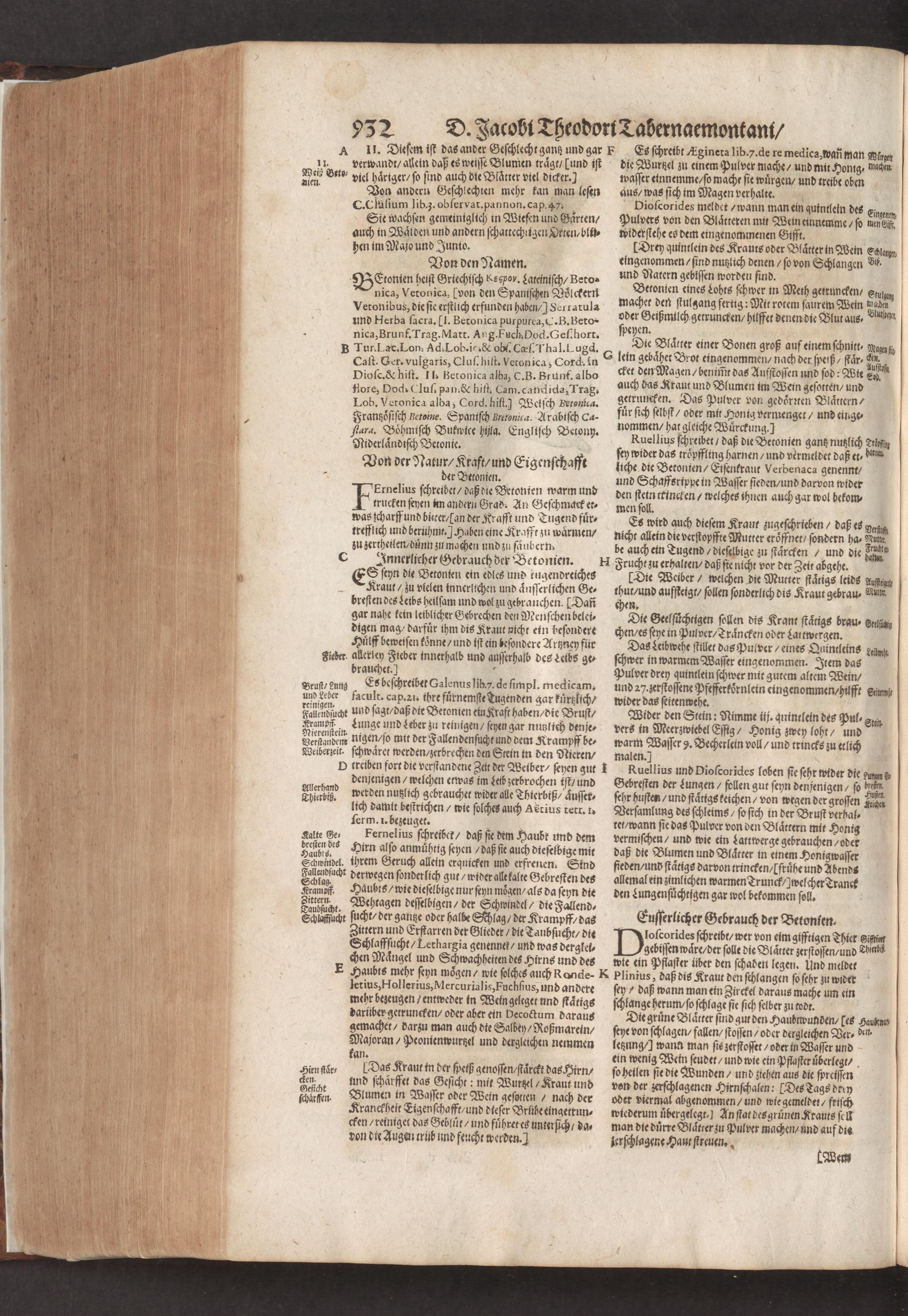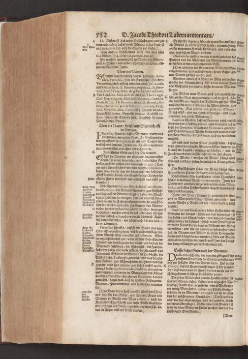 D. Jacobi Theodori Tabernaemontani, Neu vollkommen Kräuter-Buch : Darinnen Uber 3000. Kräuter/ mit schönen und kunstlichen Figuren/ auch deren Underscheid und Würckung/ samt ihren Namen in mancherley Sprachen/ beschrieben: Desgleichen auch/ wie dieselbige in allerhand Kranckheiten/ beyde der Menschen und des Viehs/ sollen angewendet und gebraucht werden/ angezeigt wird. Erstlichen durch Casparum Bauhinum D. und Profess. Basil. mit vielen neuen Figuren/ nutzlichen Artzneyen/ und anderem/ mit sonderem Fleis gebesseret/ Zum Andern Durch Hieronymum Bauhinum D. und Profess. Basil. mit sehr nutzlichen Marginalien, Synonimis, neuen Registeren und anderem vermehrt