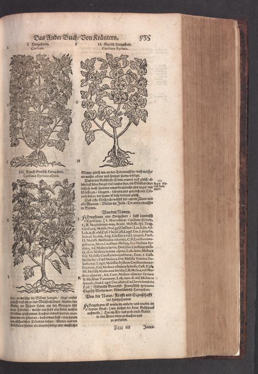D. Jacobi Theodori Tabernaemontani, Neu vollkommen Kräuter-Buch : Darinnen Uber 3000. Kräuter/ mit schönen und kunstlichen Figuren/ auch deren Underscheid und Würckung/ samt ihren Namen in mancherley Sprachen/ beschrieben: Desgleichen auch/ wie dieselbige in allerhand Kranckheiten/ beyde der Menschen und des Viehs/ sollen angewendet und gebraucht werden/ angezeigt wird. Erstlichen durch Casparum Bauhinum D. und Profess. Basil. mit vielen neuen Figuren/ nutzlichen Artzneyen/ und anderem/ mit sonderem Fleis gebesseret/ Zum Andern Durch Hieronymum Bauhinum D. und Profess. Basil. mit sehr nutzlichen Marginalien, Synonimis, neuen Registeren und anderem vermehrt