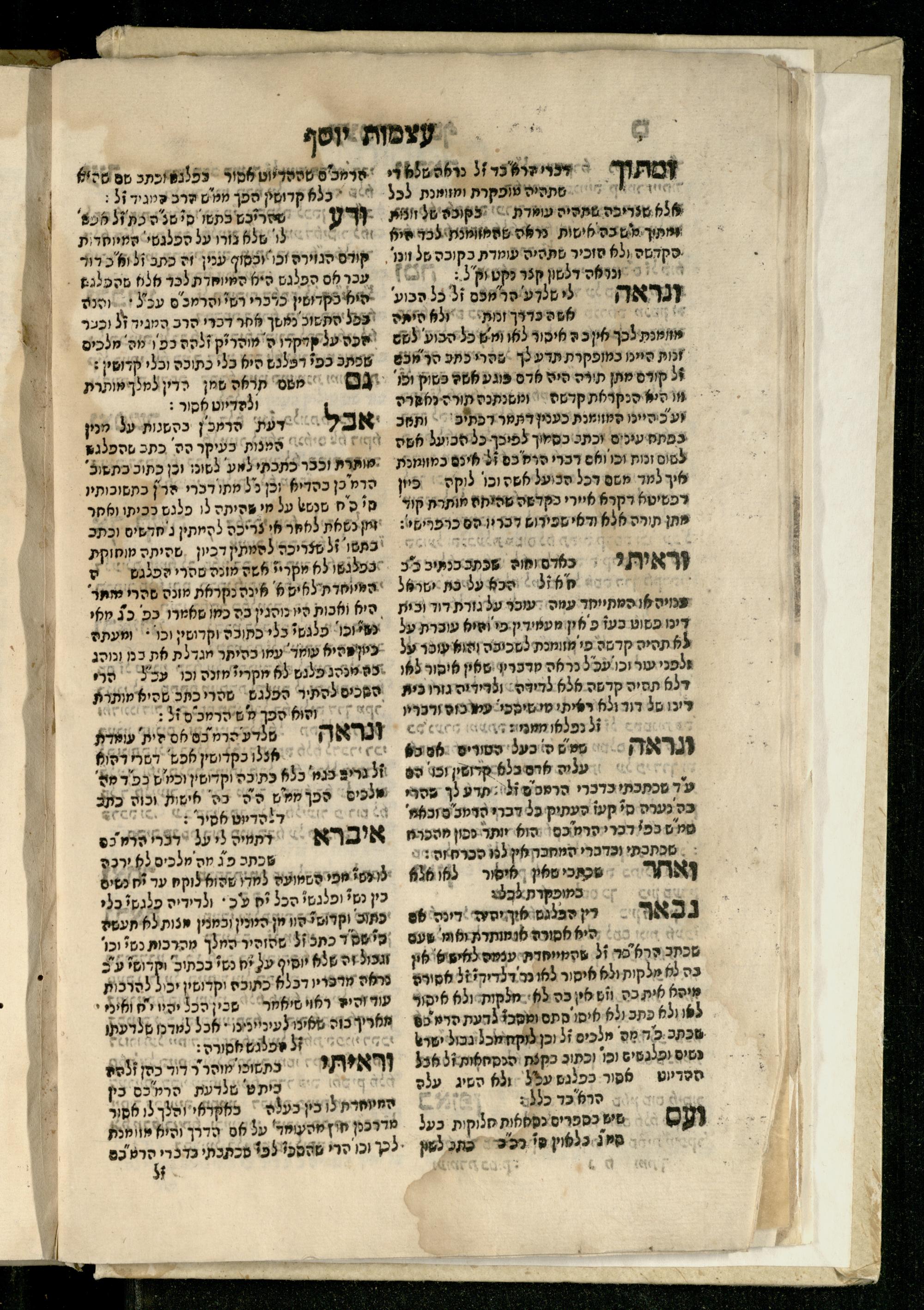 Sefer ʿAtsmot Yosef : ṿe-hu beʾur kelalim meḥudashim she-ha-Torah nidreshet ba-hem ... : gam ba ha-beʾur be-ʿiyun u-ve-filpul nimrats be-masekhet Ḳidushin mi-teḥilatah ʿad sofah ... gam ... be-sugyat Parah ṿe-Raḥel be-p. Kol ha-baśar u-ve-sof pereḳ Ketsad ha-regel ... / ḥibartiṿ ṿe-gam yisadtiṿ ani ha-tsaʿir Yosef ben Yitsḥaḳ ... n. ʿEzra ...ספר עצמות יוסף : והוא ביאור כללים מחודשים שהתורה נדרשת בהם ... : גם בא הבאור בעיון בעיון ובפלפול נמרץ במסכת קידושין מתחילתה עד סופה ... גם ... בסוגיית פרה ורחל בפ׳ כל הבשר ובסוף פרק כיצד הרגל ... / חברתיו וגם יסדתיו אני הצעיר יוסף בן יצחק ... ן׳ עזרא ...