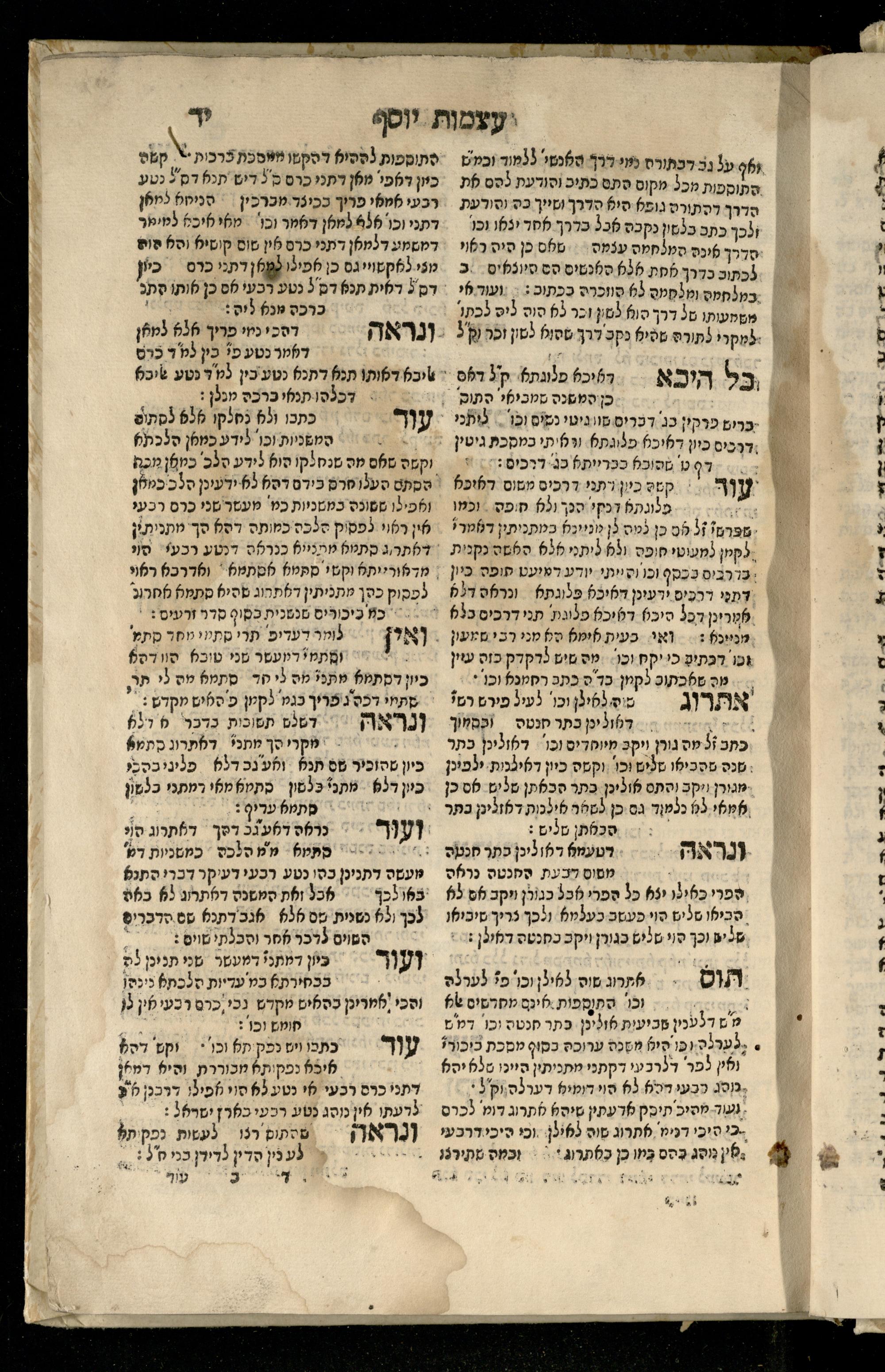 Sefer ʿAtsmot Yosef : ṿe-hu beʾur kelalim meḥudashim she-ha-Torah nidreshet ba-hem ... : gam ba ha-beʾur be-ʿiyun u-ve-filpul nimrats be-masekhet Ḳidushin mi-teḥilatah ʿad sofah ... gam ... be-sugyat Parah ṿe-Raḥel be-p. Kol ha-baśar u-ve-sof pereḳ Ketsad ha-regel ... / ḥibartiṿ ṿe-gam yisadtiṿ ani ha-tsaʿir Yosef ben Yitsḥaḳ ... n. ʿEzra ...ספר עצמות יוסף : והוא ביאור כללים מחודשים שהתורה נדרשת בהם ... : גם בא הבאור בעיון בעיון ובפלפול נמרץ במסכת קידושין מתחילתה עד סופה ... גם ... בסוגיית פרה ורחל בפ׳ כל הבשר ובסוף פרק כיצד הרגל ... / חברתיו וגם יסדתיו אני הצעיר יוסף בן יצחק ... ן׳ עזרא ...