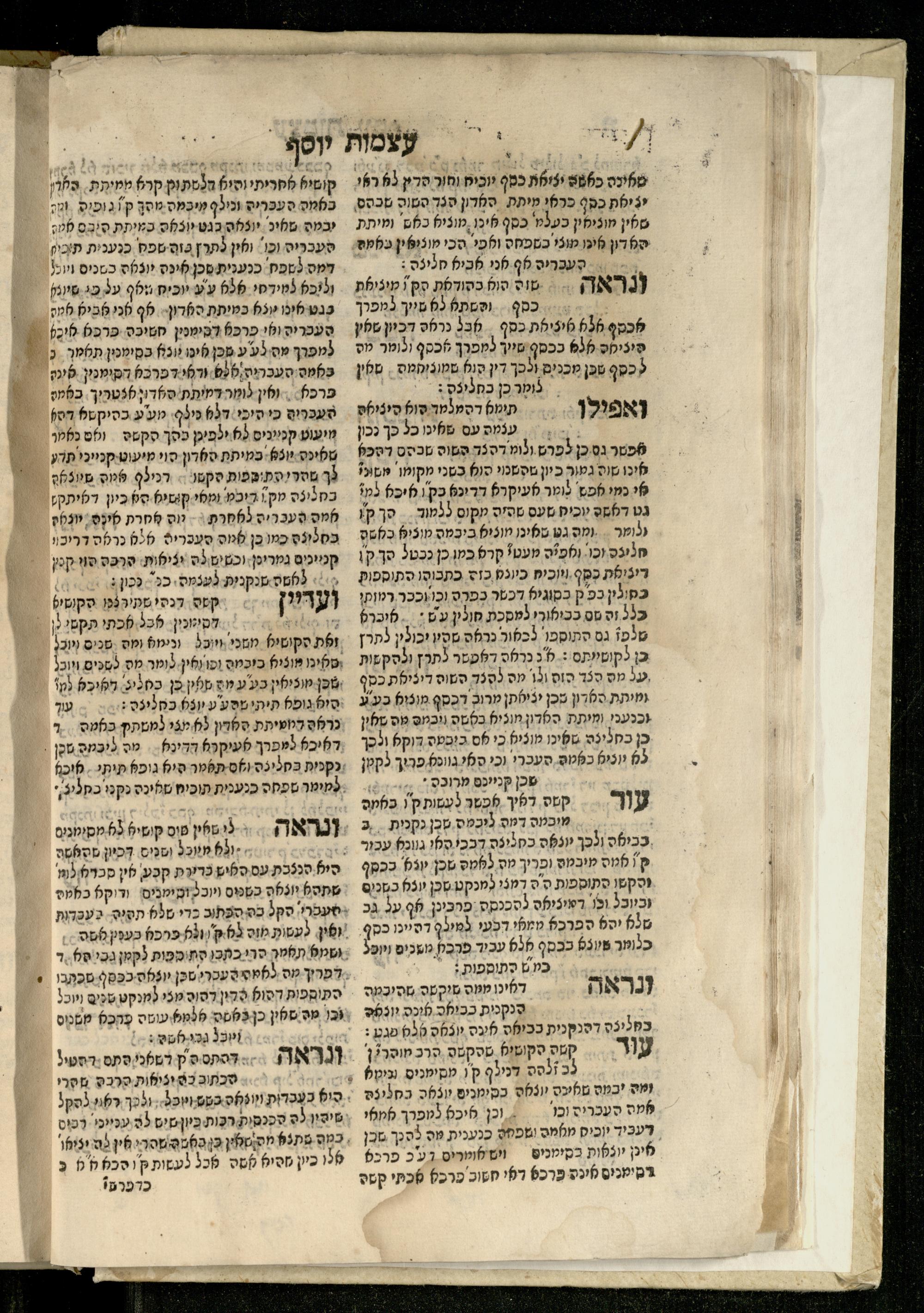Sefer ʿAtsmot Yosef : ṿe-hu beʾur kelalim meḥudashim she-ha-Torah nidreshet ba-hem ... : gam ba ha-beʾur be-ʿiyun u-ve-filpul nimrats be-masekhet Ḳidushin mi-teḥilatah ʿad sofah ... gam ... be-sugyat Parah ṿe-Raḥel be-p. Kol ha-baśar u-ve-sof pereḳ Ketsad ha-regel ... / ḥibartiṿ ṿe-gam yisadtiṿ ani ha-tsaʿir Yosef ben Yitsḥaḳ ... n. ʿEzra ...ספר עצמות יוסף : והוא ביאור כללים מחודשים שהתורה נדרשת בהם ... : גם בא הבאור בעיון בעיון ובפלפול נמרץ במסכת קידושין מתחילתה עד סופה ... גם ... בסוגיית פרה ורחל בפ׳ כל הבשר ובסוף פרק כיצד הרגל ... / חברתיו וגם יסדתיו אני הצעיר יוסף בן יצחק ... ן׳ עזרא ...