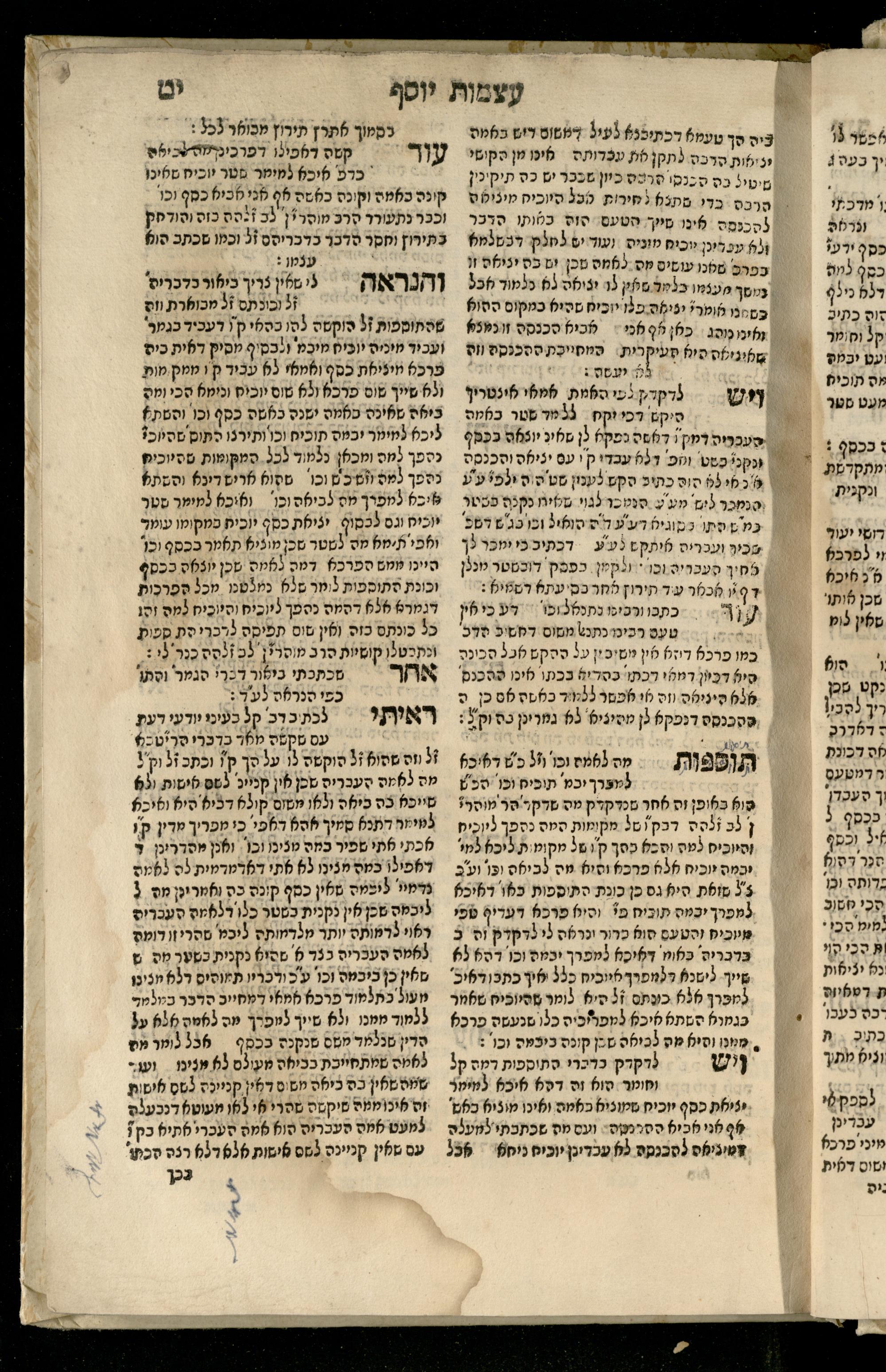 Sefer ʿAtsmot Yosef : ṿe-hu beʾur kelalim meḥudashim she-ha-Torah nidreshet ba-hem ... : gam ba ha-beʾur be-ʿiyun u-ve-filpul nimrats be-masekhet Ḳidushin mi-teḥilatah ʿad sofah ... gam ... be-sugyat Parah ṿe-Raḥel be-p. Kol ha-baśar u-ve-sof pereḳ Ketsad ha-regel ... / ḥibartiṿ ṿe-gam yisadtiṿ ani ha-tsaʿir Yosef ben Yitsḥaḳ ... n. ʿEzra ...ספר עצמות יוסף : והוא ביאור כללים מחודשים שהתורה נדרשת בהם ... : גם בא הבאור בעיון בעיון ובפלפול נמרץ במסכת קידושין מתחילתה עד סופה ... גם ... בסוגיית פרה ורחל בפ׳ כל הבשר ובסוף פרק כיצד הרגל ... / חברתיו וגם יסדתיו אני הצעיר יוסף בן יצחק ... ן׳ עזרא ...