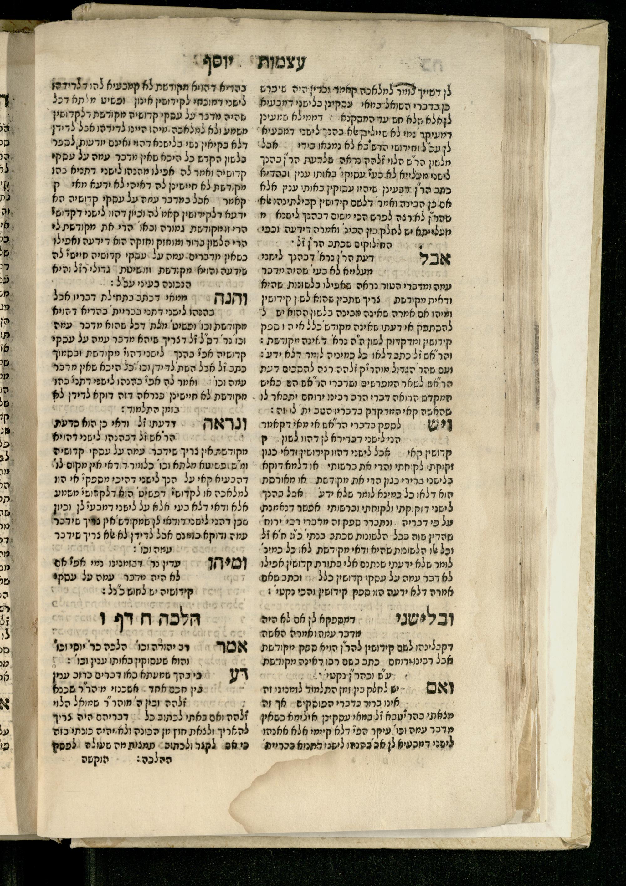 Sefer ʿAtsmot Yosef : ṿe-hu beʾur kelalim meḥudashim she-ha-Torah nidreshet ba-hem ... : gam ba ha-beʾur be-ʿiyun u-ve-filpul nimrats be-masekhet Ḳidushin mi-teḥilatah ʿad sofah ... gam ... be-sugyat Parah ṿe-Raḥel be-p. Kol ha-baśar u-ve-sof pereḳ Ketsad ha-regel ... / ḥibartiṿ ṿe-gam yisadtiṿ ani ha-tsaʿir Yosef ben Yitsḥaḳ ... n. ʿEzra ...ספר עצמות יוסף : והוא ביאור כללים מחודשים שהתורה נדרשת בהם ... : גם בא הבאור בעיון בעיון ובפלפול נמרץ במסכת קידושין מתחילתה עד סופה ... גם ... בסוגיית פרה ורחל בפ׳ כל הבשר ובסוף פרק כיצד הרגל ... / חברתיו וגם יסדתיו אני הצעיר יוסף בן יצחק ... ן׳ עזרא ...