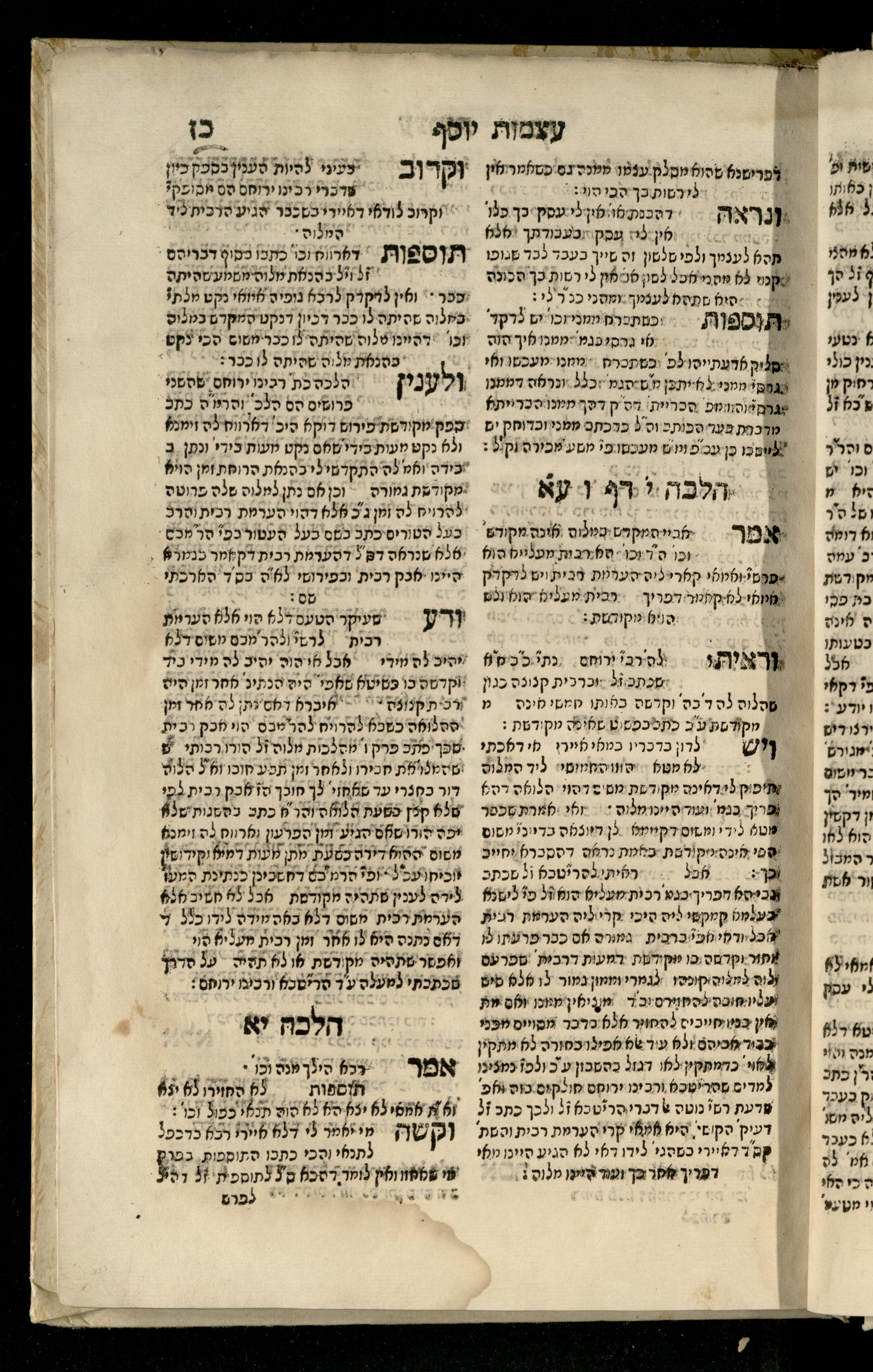 Sefer ʿAtsmot Yosef : ṿe-hu beʾur kelalim meḥudashim she-ha-Torah nidreshet ba-hem ... : gam ba ha-beʾur be-ʿiyun u-ve-filpul nimrats be-masekhet Ḳidushin mi-teḥilatah ʿad sofah ... gam ... be-sugyat Parah ṿe-Raḥel be-p. Kol ha-baśar u-ve-sof pereḳ Ketsad ha-regel ... / ḥibartiṿ ṿe-gam yisadtiṿ ani ha-tsaʿir Yosef ben Yitsḥaḳ ... n. ʿEzra ...ספר עצמות יוסף : והוא ביאור כללים מחודשים שהתורה נדרשת בהם ... : גם בא הבאור בעיון בעיון ובפלפול נמרץ במסכת קידושין מתחילתה עד סופה ... גם ... בסוגיית פרה ורחל בפ׳ כל הבשר ובסוף פרק כיצד הרגל ... / חברתיו וגם יסדתיו אני הצעיר יוסף בן יצחק ... ן׳ עזרא ...
