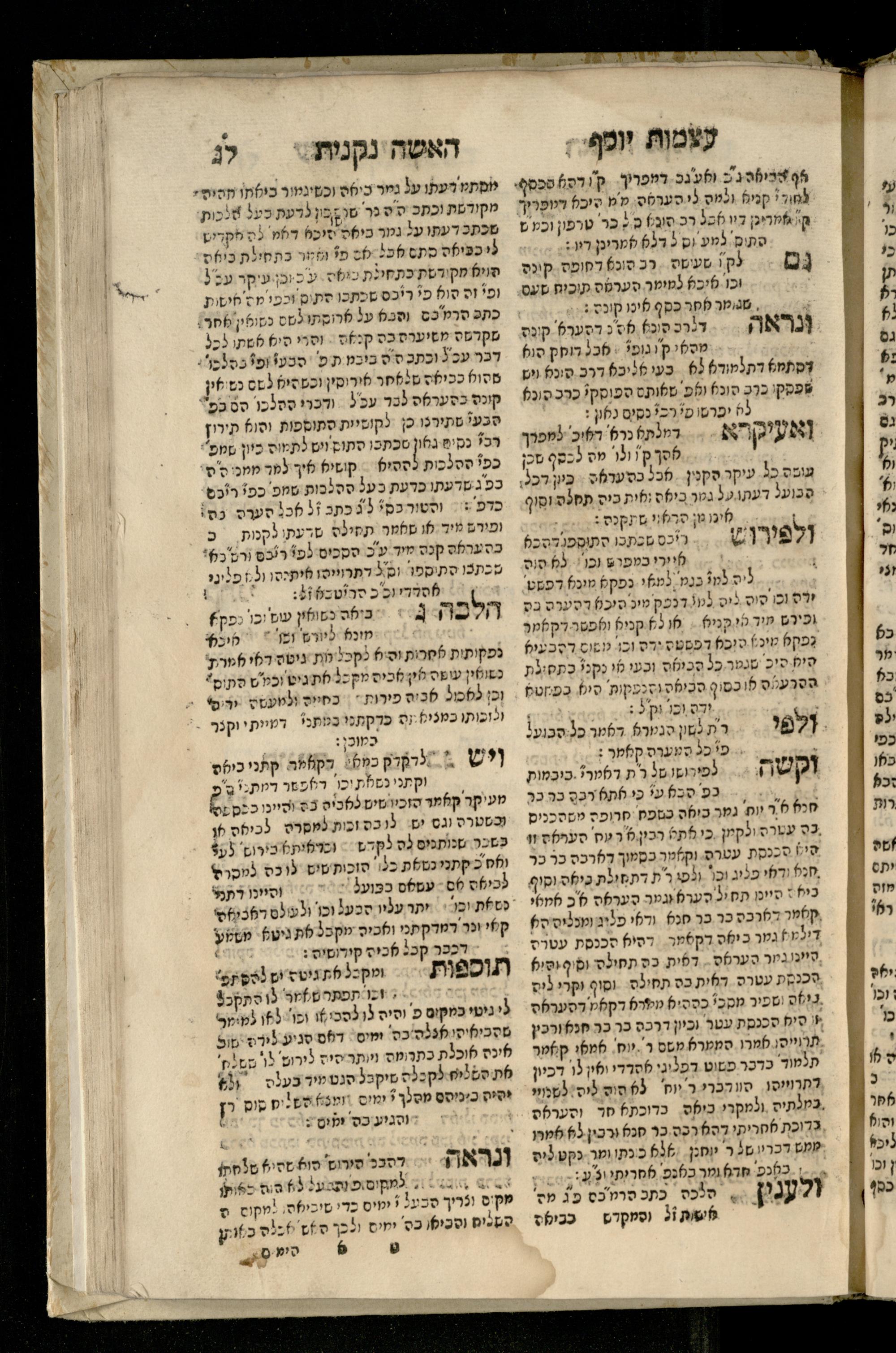 Sefer ʿAtsmot Yosef : ṿe-hu beʾur kelalim meḥudashim she-ha-Torah nidreshet ba-hem ... : gam ba ha-beʾur be-ʿiyun u-ve-filpul nimrats be-masekhet Ḳidushin mi-teḥilatah ʿad sofah ... gam ... be-sugyat Parah ṿe-Raḥel be-p. Kol ha-baśar u-ve-sof pereḳ Ketsad ha-regel ... / ḥibartiṿ ṿe-gam yisadtiṿ ani ha-tsaʿir Yosef ben Yitsḥaḳ ... n. ʿEzra ...ספר עצמות יוסף : והוא ביאור כללים מחודשים שהתורה נדרשת בהם ... : גם בא הבאור בעיון בעיון ובפלפול נמרץ במסכת קידושין מתחילתה עד סופה ... גם ... בסוגיית פרה ורחל בפ׳ כל הבשר ובסוף פרק כיצד הרגל ... / חברתיו וגם יסדתיו אני הצעיר יוסף בן יצחק ... ן׳ עזרא ...