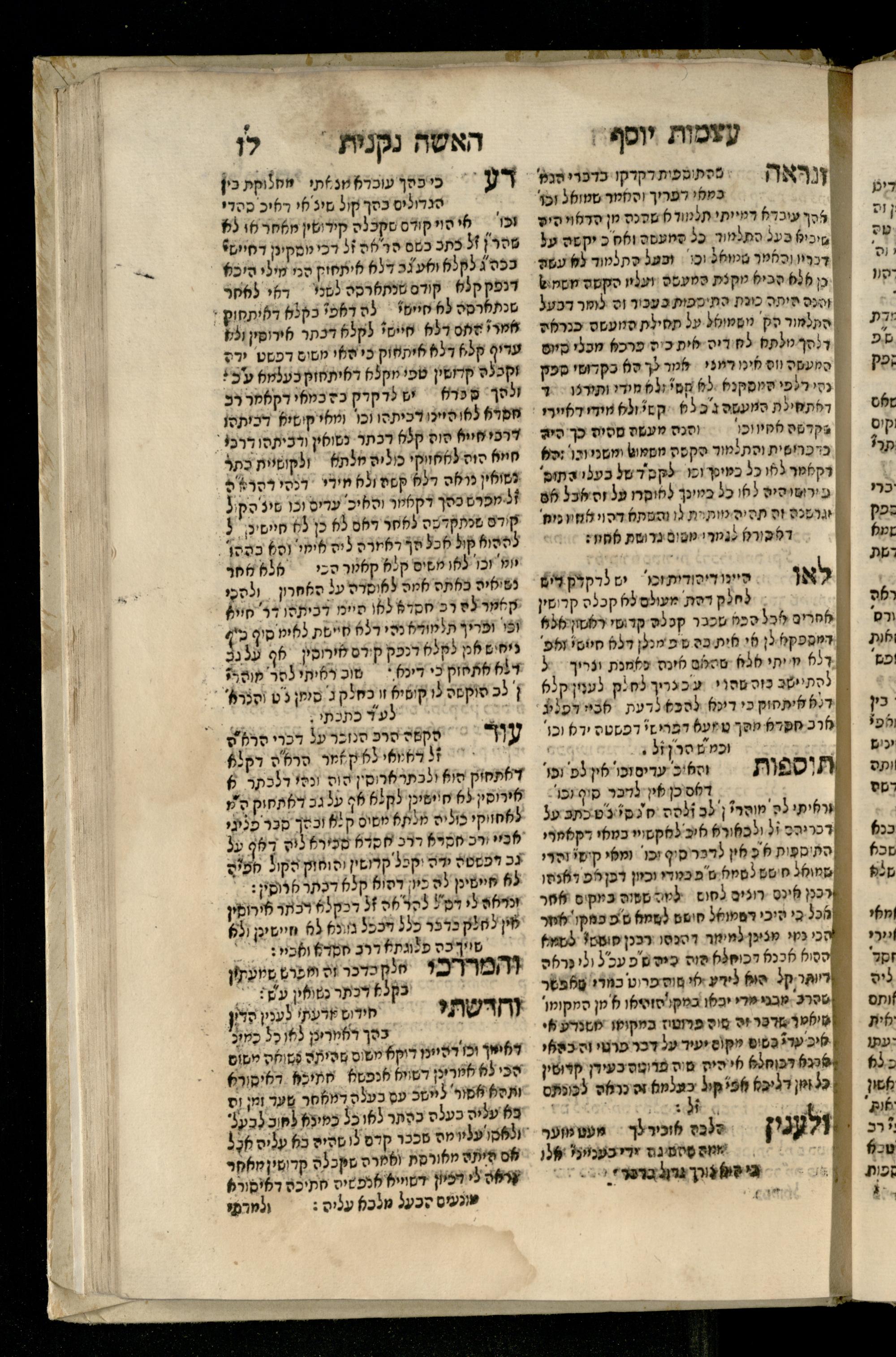 Sefer ʿAtsmot Yosef : ṿe-hu beʾur kelalim meḥudashim she-ha-Torah nidreshet ba-hem ... : gam ba ha-beʾur be-ʿiyun u-ve-filpul nimrats be-masekhet Ḳidushin mi-teḥilatah ʿad sofah ... gam ... be-sugyat Parah ṿe-Raḥel be-p. Kol ha-baśar u-ve-sof pereḳ Ketsad ha-regel ... / ḥibartiṿ ṿe-gam yisadtiṿ ani ha-tsaʿir Yosef ben Yitsḥaḳ ... n. ʿEzra ...ספר עצמות יוסף : והוא ביאור כללים מחודשים שהתורה נדרשת בהם ... : גם בא הבאור בעיון בעיון ובפלפול נמרץ במסכת קידושין מתחילתה עד סופה ... גם ... בסוגיית פרה ורחל בפ׳ כל הבשר ובסוף פרק כיצד הרגל ... / חברתיו וגם יסדתיו אני הצעיר יוסף בן יצחק ... ן׳ עזרא ...