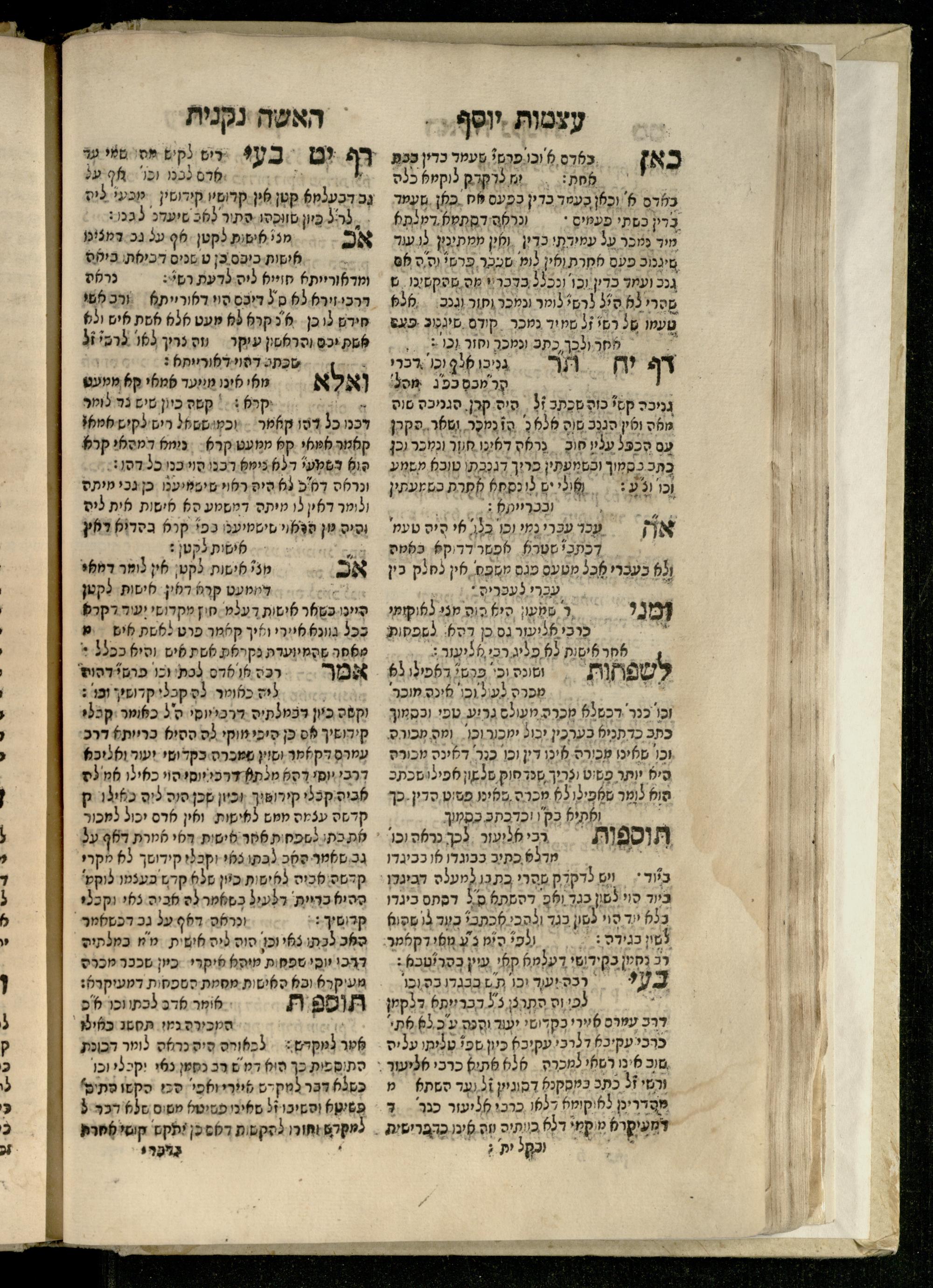 Sefer ʿAtsmot Yosef : ṿe-hu beʾur kelalim meḥudashim she-ha-Torah nidreshet ba-hem ... : gam ba ha-beʾur be-ʿiyun u-ve-filpul nimrats be-masekhet Ḳidushin mi-teḥilatah ʿad sofah ... gam ... be-sugyat Parah ṿe-Raḥel be-p. Kol ha-baśar u-ve-sof pereḳ Ketsad ha-regel ... / ḥibartiṿ ṿe-gam yisadtiṿ ani ha-tsaʿir Yosef ben Yitsḥaḳ ... n. ʿEzra ...ספר עצמות יוסף : והוא ביאור כללים מחודשים שהתורה נדרשת בהם ... : גם בא הבאור בעיון בעיון ובפלפול נמרץ במסכת קידושין מתחילתה עד סופה ... גם ... בסוגיית פרה ורחל בפ׳ כל הבשר ובסוף פרק כיצד הרגל ... / חברתיו וגם יסדתיו אני הצעיר יוסף בן יצחק ... ן׳ עזרא ...