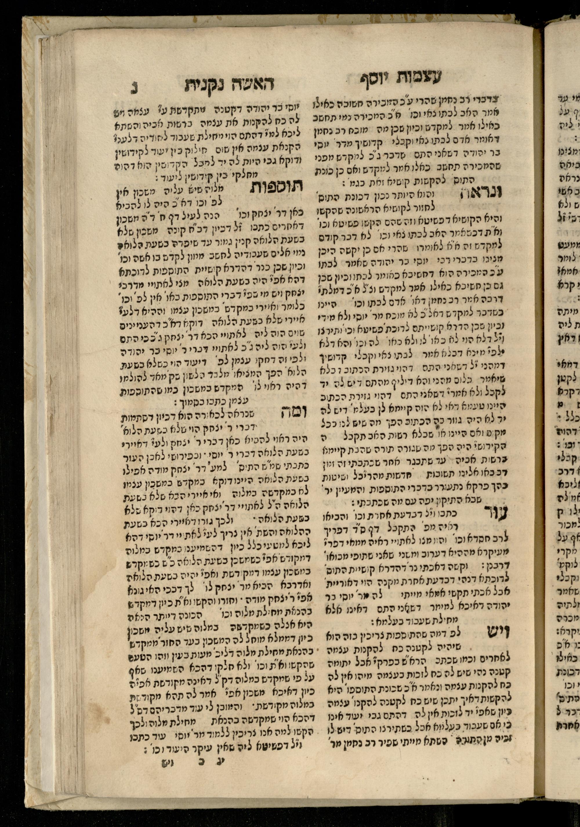 Sefer ʿAtsmot Yosef : ṿe-hu beʾur kelalim meḥudashim she-ha-Torah nidreshet ba-hem ... : gam ba ha-beʾur be-ʿiyun u-ve-filpul nimrats be-masekhet Ḳidushin mi-teḥilatah ʿad sofah ... gam ... be-sugyat Parah ṿe-Raḥel be-p. Kol ha-baśar u-ve-sof pereḳ Ketsad ha-regel ... / ḥibartiṿ ṿe-gam yisadtiṿ ani ha-tsaʿir Yosef ben Yitsḥaḳ ... n. ʿEzra ...ספר עצמות יוסף : והוא ביאור כללים מחודשים שהתורה נדרשת בהם ... : גם בא הבאור בעיון בעיון ובפלפול נמרץ במסכת קידושין מתחילתה עד סופה ... גם ... בסוגיית פרה ורחל בפ׳ כל הבשר ובסוף פרק כיצד הרגל ... / חברתיו וגם יסדתיו אני הצעיר יוסף בן יצחק ... ן׳ עזרא ...
