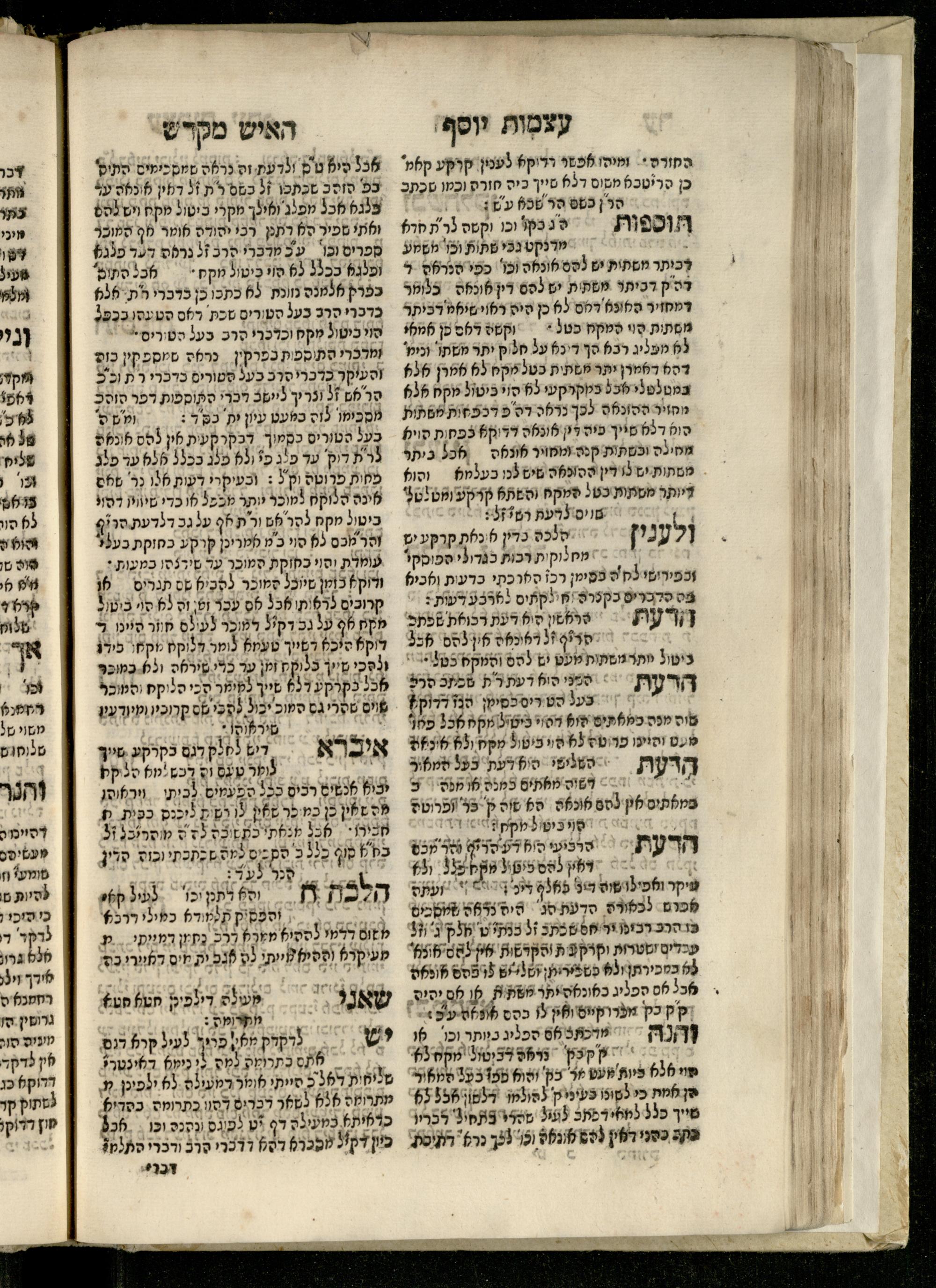 Sefer ʿAtsmot Yosef : ṿe-hu beʾur kelalim meḥudashim she-ha-Torah nidreshet ba-hem ... : gam ba ha-beʾur be-ʿiyun u-ve-filpul nimrats be-masekhet Ḳidushin mi-teḥilatah ʿad sofah ... gam ... be-sugyat Parah ṿe-Raḥel be-p. Kol ha-baśar u-ve-sof pereḳ Ketsad ha-regel ... / ḥibartiṿ ṿe-gam yisadtiṿ ani ha-tsaʿir Yosef ben Yitsḥaḳ ... n. ʿEzra ...ספר עצמות יוסף : והוא ביאור כללים מחודשים שהתורה נדרשת בהם ... : גם בא הבאור בעיון בעיון ובפלפול נמרץ במסכת קידושין מתחילתה עד סופה ... גם ... בסוגיית פרה ורחל בפ׳ כל הבשר ובסוף פרק כיצד הרגל ... / חברתיו וגם יסדתיו אני הצעיר יוסף בן יצחק ... ן׳ עזרא ...