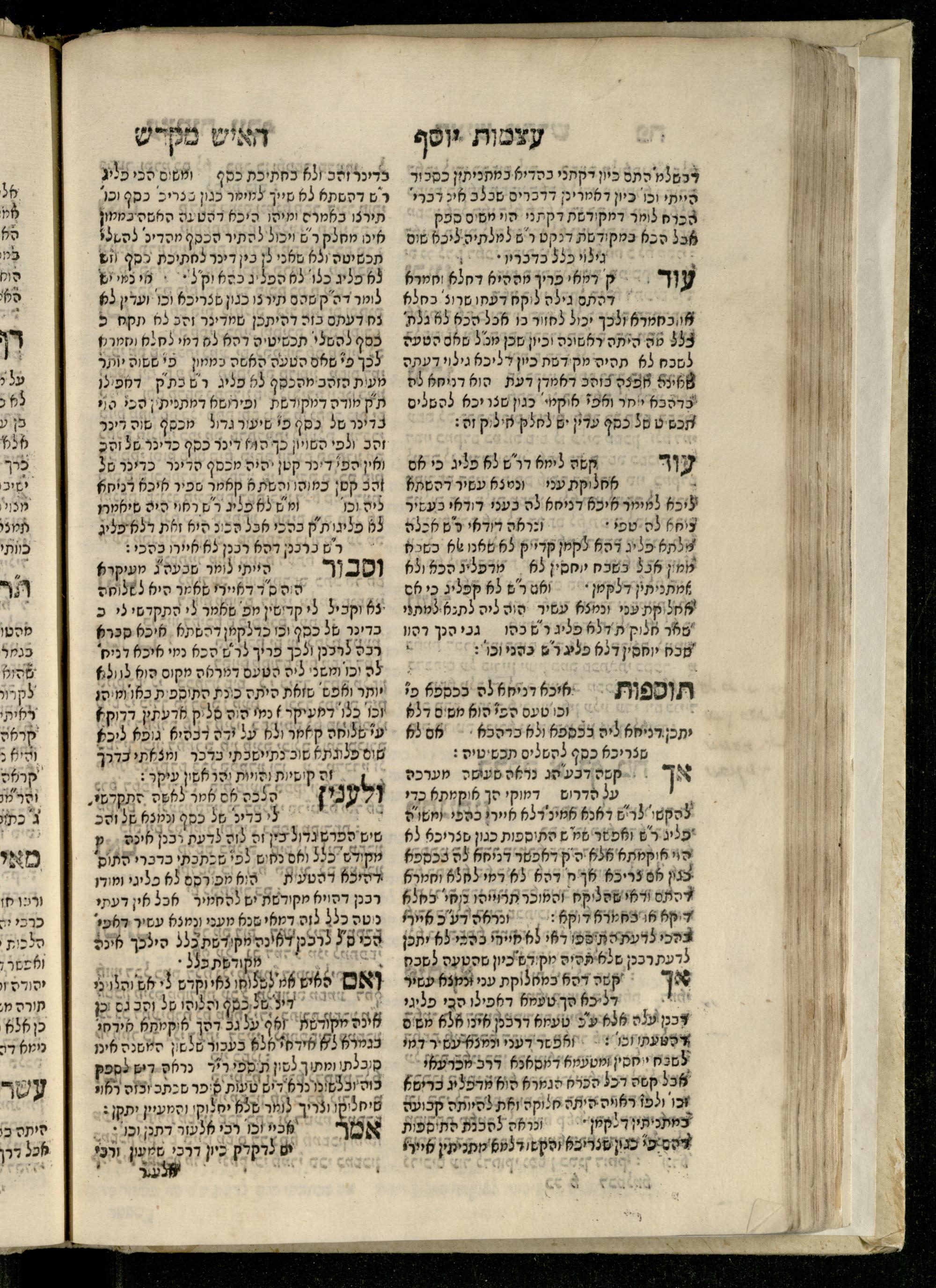 Sefer ʿAtsmot Yosef : ṿe-hu beʾur kelalim meḥudashim she-ha-Torah nidreshet ba-hem ... : gam ba ha-beʾur be-ʿiyun u-ve-filpul nimrats be-masekhet Ḳidushin mi-teḥilatah ʿad sofah ... gam ... be-sugyat Parah ṿe-Raḥel be-p. Kol ha-baśar u-ve-sof pereḳ Ketsad ha-regel ... / ḥibartiṿ ṿe-gam yisadtiṿ ani ha-tsaʿir Yosef ben Yitsḥaḳ ... n. ʿEzra ...ספר עצמות יוסף : והוא ביאור כללים מחודשים שהתורה נדרשת בהם ... : גם בא הבאור בעיון בעיון ובפלפול נמרץ במסכת קידושין מתחילתה עד סופה ... גם ... בסוגיית פרה ורחל בפ׳ כל הבשר ובסוף פרק כיצד הרגל ... / חברתיו וגם יסדתיו אני הצעיר יוסף בן יצחק ... ן׳ עזרא ...