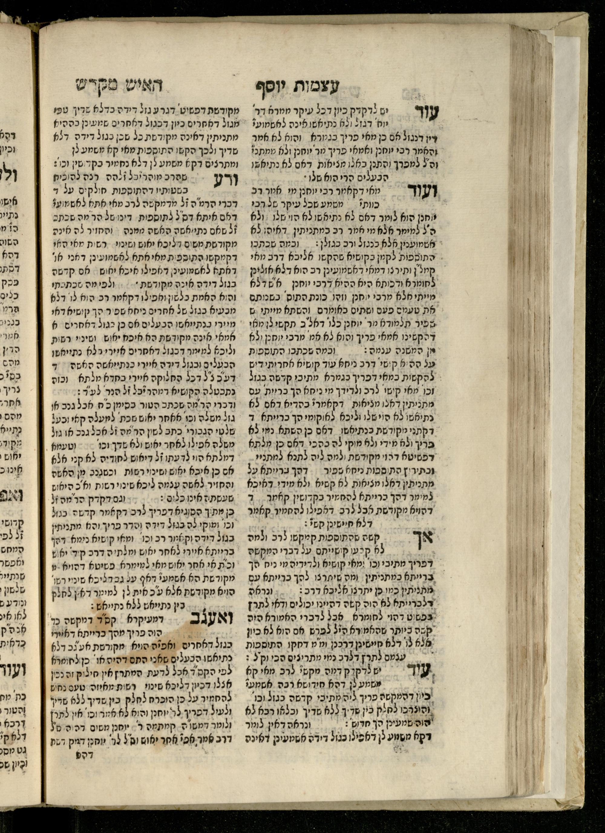 Sefer ʿAtsmot Yosef : ṿe-hu beʾur kelalim meḥudashim she-ha-Torah nidreshet ba-hem ... : gam ba ha-beʾur be-ʿiyun u-ve-filpul nimrats be-masekhet Ḳidushin mi-teḥilatah ʿad sofah ... gam ... be-sugyat Parah ṿe-Raḥel be-p. Kol ha-baśar u-ve-sof pereḳ Ketsad ha-regel ... / ḥibartiṿ ṿe-gam yisadtiṿ ani ha-tsaʿir Yosef ben Yitsḥaḳ ... n. ʿEzra ...ספר עצמות יוסף : והוא ביאור כללים מחודשים שהתורה נדרשת בהם ... : גם בא הבאור בעיון בעיון ובפלפול נמרץ במסכת קידושין מתחילתה עד סופה ... גם ... בסוגיית פרה ורחל בפ׳ כל הבשר ובסוף פרק כיצד הרגל ... / חברתיו וגם יסדתיו אני הצעיר יוסף בן יצחק ... ן׳ עזרא ...