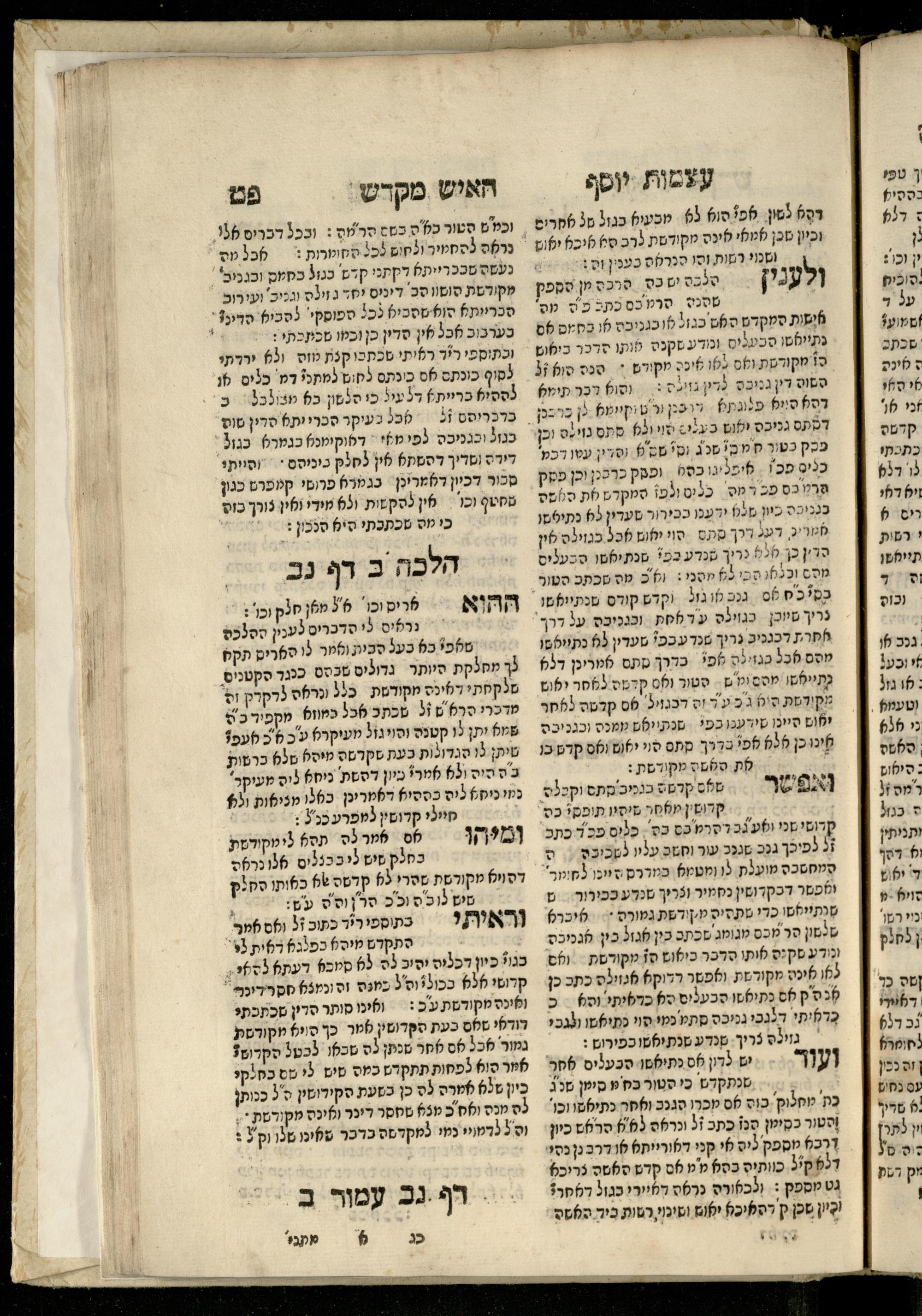 Sefer ʿAtsmot Yosef : ṿe-hu beʾur kelalim meḥudashim she-ha-Torah nidreshet ba-hem ... : gam ba ha-beʾur be-ʿiyun u-ve-filpul nimrats be-masekhet Ḳidushin mi-teḥilatah ʿad sofah ... gam ... be-sugyat Parah ṿe-Raḥel be-p. Kol ha-baśar u-ve-sof pereḳ Ketsad ha-regel ... / ḥibartiṿ ṿe-gam yisadtiṿ ani ha-tsaʿir Yosef ben Yitsḥaḳ ... n. ʿEzra ...ספר עצמות יוסף : והוא ביאור כללים מחודשים שהתורה נדרשת בהם ... : גם בא הבאור בעיון בעיון ובפלפול נמרץ במסכת קידושין מתחילתה עד סופה ... גם ... בסוגיית פרה ורחל בפ׳ כל הבשר ובסוף פרק כיצד הרגל ... / חברתיו וגם יסדתיו אני הצעיר יוסף בן יצחק ... ן׳ עזרא ...