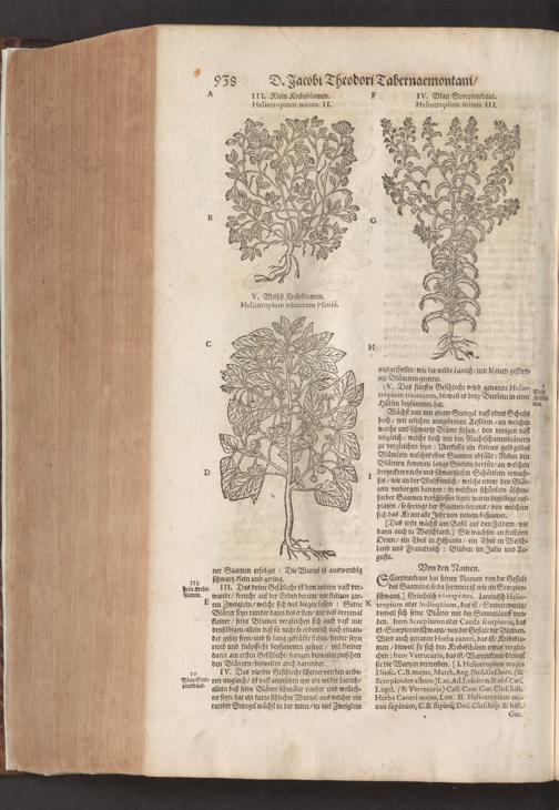 D. Jacobi Theodori Tabernaemontani, Neu vollkommen Kräuter-Buch : Darinnen Uber 3000. Kräuter/ mit schönen und kunstlichen Figuren/ auch deren Underscheid und Würckung/ samt ihren Namen in mancherley Sprachen/ beschrieben: Desgleichen auch/ wie dieselbige in allerhand Kranckheiten/ beyde der Menschen und des Viehs/ sollen angewendet und gebraucht werden/ angezeigt wird. Erstlichen durch Casparum Bauhinum D. und Profess. Basil. mit vielen neuen Figuren/ nutzlichen Artzneyen/ und anderem/ mit sonderem Fleis gebesseret/ Zum Andern Durch Hieronymum Bauhinum D. und Profess. Basil. mit sehr nutzlichen Marginalien, Synonimis, neuen Registeren und anderem vermehrt
