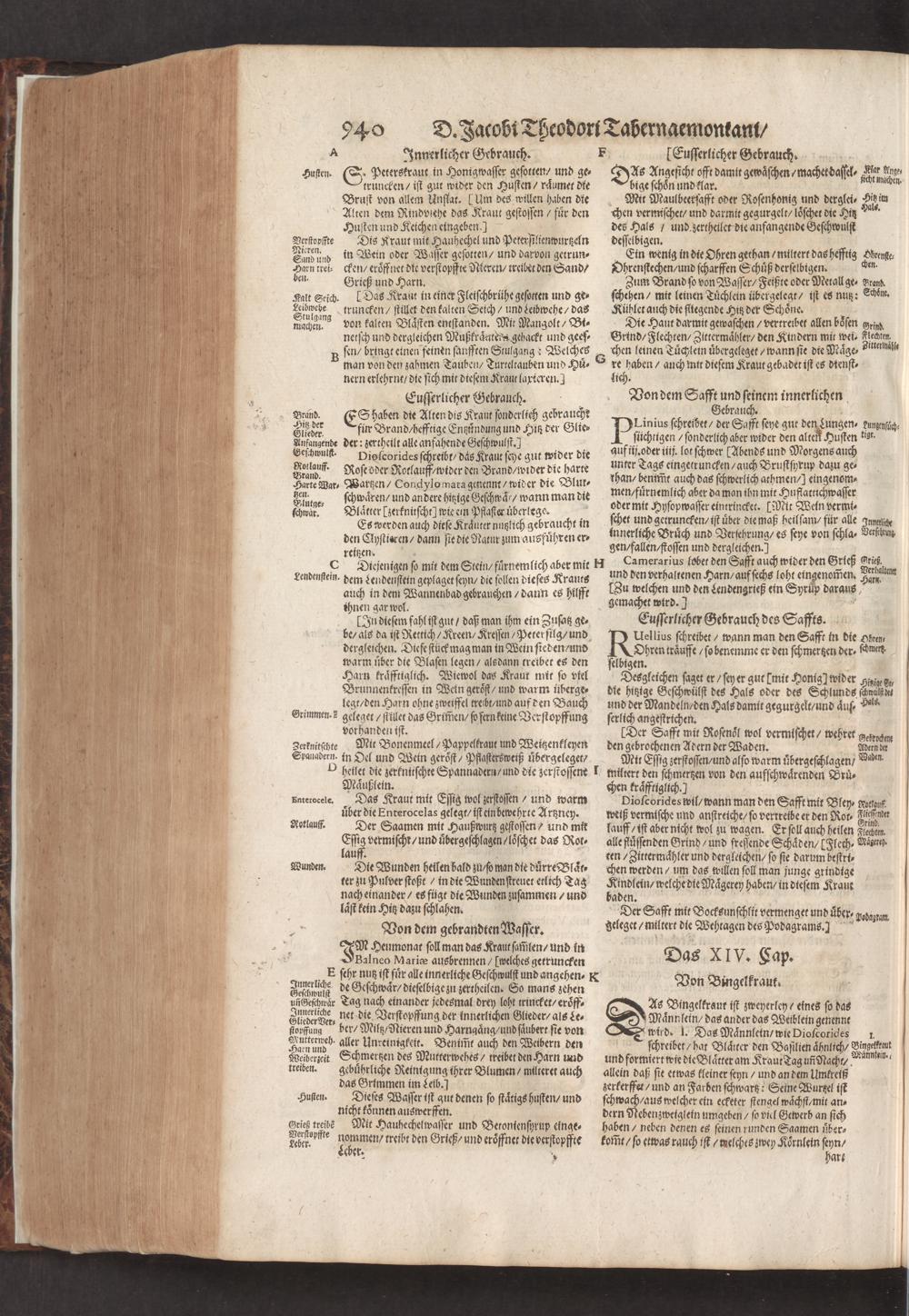 D. Jacobi Theodori Tabernaemontani, Neu vollkommen Kräuter-Buch : Darinnen Uber 3000. Kräuter/ mit schönen und kunstlichen Figuren/ auch deren Underscheid und Würckung/ samt ihren Namen in mancherley Sprachen/ beschrieben: Desgleichen auch/ wie dieselbige in allerhand Kranckheiten/ beyde der Menschen und des Viehs/ sollen angewendet und gebraucht werden/ angezeigt wird. Erstlichen durch Casparum Bauhinum D. und Profess. Basil. mit vielen neuen Figuren/ nutzlichen Artzneyen/ und anderem/ mit sonderem Fleis gebesseret/ Zum Andern Durch Hieronymum Bauhinum D. und Profess. Basil. mit sehr nutzlichen Marginalien, Synonimis, neuen Registeren und anderem vermehrt
