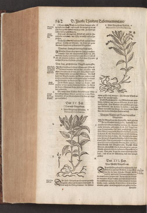 D. Jacobi Theodori Tabernaemontani, Neu vollkommen Kräuter-Buch : Darinnen Uber 3000. Kräuter/ mit schönen und kunstlichen Figuren/ auch deren Underscheid und Würckung/ samt ihren Namen in mancherley Sprachen/ beschrieben: Desgleichen auch/ wie dieselbige in allerhand Kranckheiten/ beyde der Menschen und des Viehs/ sollen angewendet und gebraucht werden/ angezeigt wird. Erstlichen durch Casparum Bauhinum D. und Profess. Basil. mit vielen neuen Figuren/ nutzlichen Artzneyen/ und anderem/ mit sonderem Fleis gebesseret/ Zum Andern Durch Hieronymum Bauhinum D. und Profess. Basil. mit sehr nutzlichen Marginalien, Synonimis, neuen Registeren und anderem vermehrt