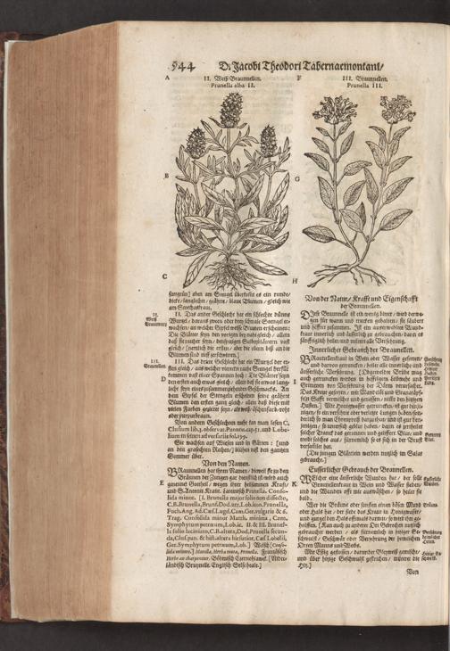 D. Jacobi Theodori Tabernaemontani, Neu vollkommen Kräuter-Buch : Darinnen Uber 3000. Kräuter/ mit schönen und kunstlichen Figuren/ auch deren Underscheid und Würckung/ samt ihren Namen in mancherley Sprachen/ beschrieben: Desgleichen auch/ wie dieselbige in allerhand Kranckheiten/ beyde der Menschen und des Viehs/ sollen angewendet und gebraucht werden/ angezeigt wird. Erstlichen durch Casparum Bauhinum D. und Profess. Basil. mit vielen neuen Figuren/ nutzlichen Artzneyen/ und anderem/ mit sonderem Fleis gebesseret/ Zum Andern Durch Hieronymum Bauhinum D. und Profess. Basil. mit sehr nutzlichen Marginalien, Synonimis, neuen Registeren und anderem vermehrt