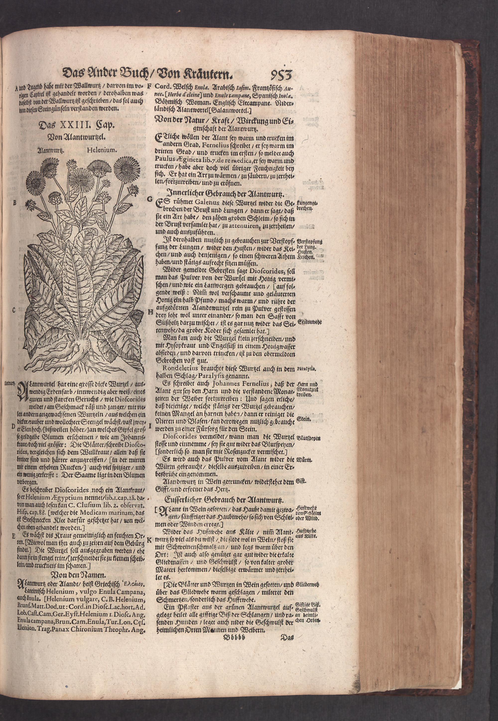 D. Jacobi Theodori Tabernaemontani, Neu vollkommen Kräuter-Buch : Darinnen Uber 3000. Kräuter/ mit schönen und kunstlichen Figuren/ auch deren Underscheid und Würckung/ samt ihren Namen in mancherley Sprachen/ beschrieben: Desgleichen auch/ wie dieselbige in allerhand Kranckheiten/ beyde der Menschen und des Viehs/ sollen angewendet und gebraucht werden/ angezeigt wird. Erstlichen durch Casparum Bauhinum D. und Profess. Basil. mit vielen neuen Figuren/ nutzlichen Artzneyen/ und anderem/ mit sonderem Fleis gebesseret/ Zum Andern Durch Hieronymum Bauhinum D. und Profess. Basil. mit sehr nutzlichen Marginalien, Synonimis, neuen Registeren und anderem vermehrt