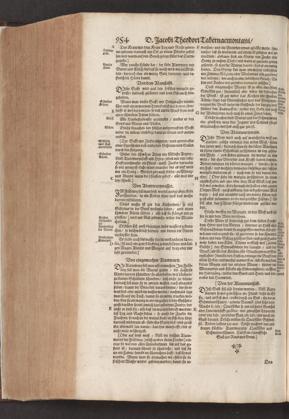D. Jacobi Theodori Tabernaemontani, Neu vollkommen Kräuter-Buch : Darinnen Uber 3000. Kräuter/ mit schönen und kunstlichen Figuren/ auch deren Underscheid und Würckung/ samt ihren Namen in mancherley Sprachen/ beschrieben: Desgleichen auch/ wie dieselbige in allerhand Kranckheiten/ beyde der Menschen und des Viehs/ sollen angewendet und gebraucht werden/ angezeigt wird. Erstlichen durch Casparum Bauhinum D. und Profess. Basil. mit vielen neuen Figuren/ nutzlichen Artzneyen/ und anderem/ mit sonderem Fleis gebesseret/ Zum Andern Durch Hieronymum Bauhinum D. und Profess. Basil. mit sehr nutzlichen Marginalien, Synonimis, neuen Registeren und anderem vermehrt