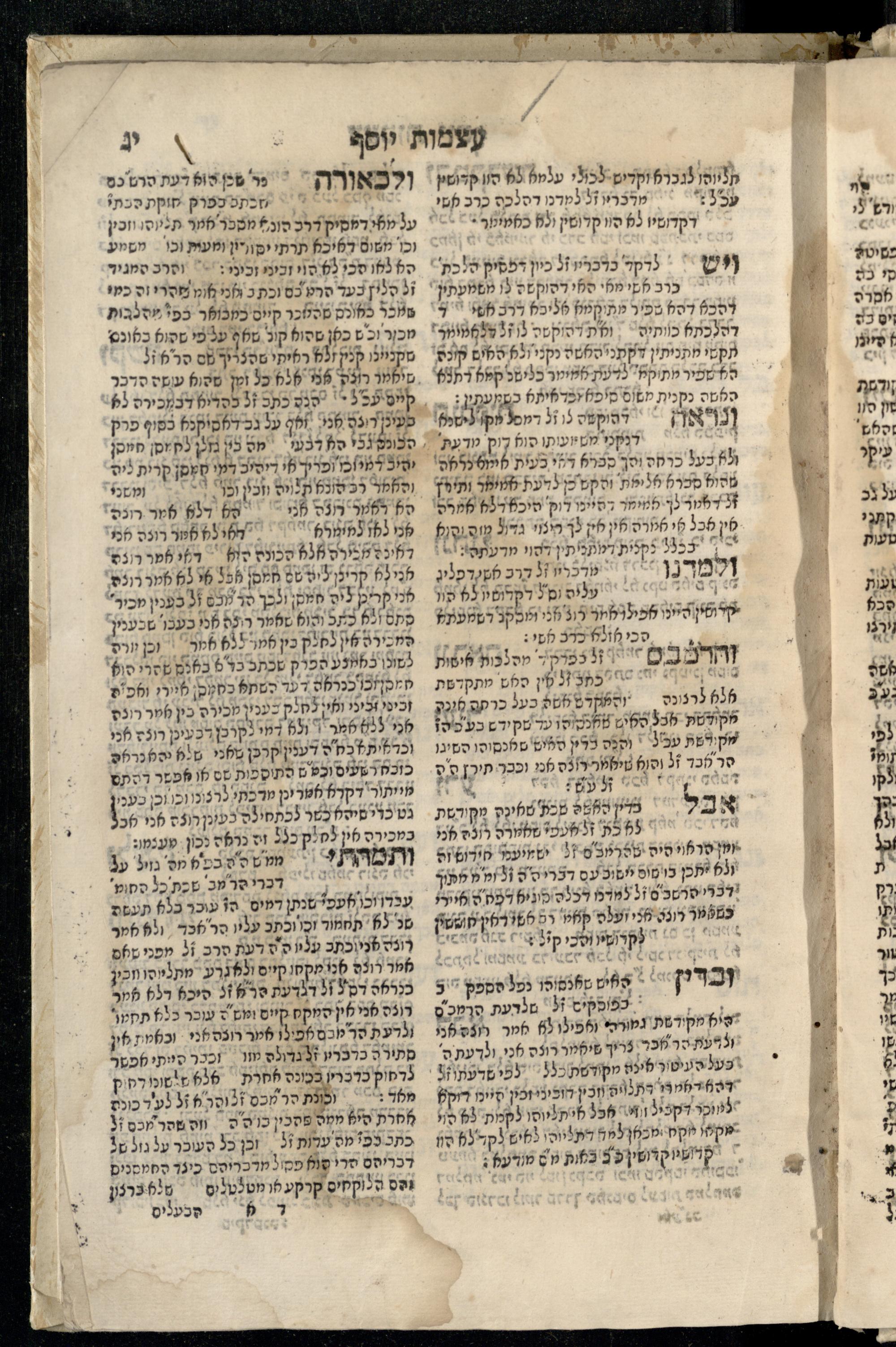 Sefer ʿAtsmot Yosef : ṿe-hu beʾur kelalim meḥudashim she-ha-Torah nidreshet ba-hem ... : gam ba ha-beʾur be-ʿiyun u-ve-filpul nimrats be-masekhet Ḳidushin mi-teḥilatah ʿad sofah ... gam ... be-sugyat Parah ṿe-Raḥel be-p. Kol ha-baśar u-ve-sof pereḳ Ketsad ha-regel ... / ḥibartiṿ ṿe-gam yisadtiṿ ani ha-tsaʿir Yosef ben Yitsḥaḳ ... n. ʿEzra ...ספר עצמות יוסף : והוא ביאור כללים מחודשים שהתורה נדרשת בהם ... : גם בא הבאור בעיון בעיון ובפלפול נמרץ במסכת קידושין מתחילתה עד סופה ... גם ... בסוגיית פרה ורחל בפ׳ כל הבשר ובסוף פרק כיצד הרגל ... / חברתיו וגם יסדתיו אני הצעיר יוסף בן יצחק ... ן׳ עזרא ...