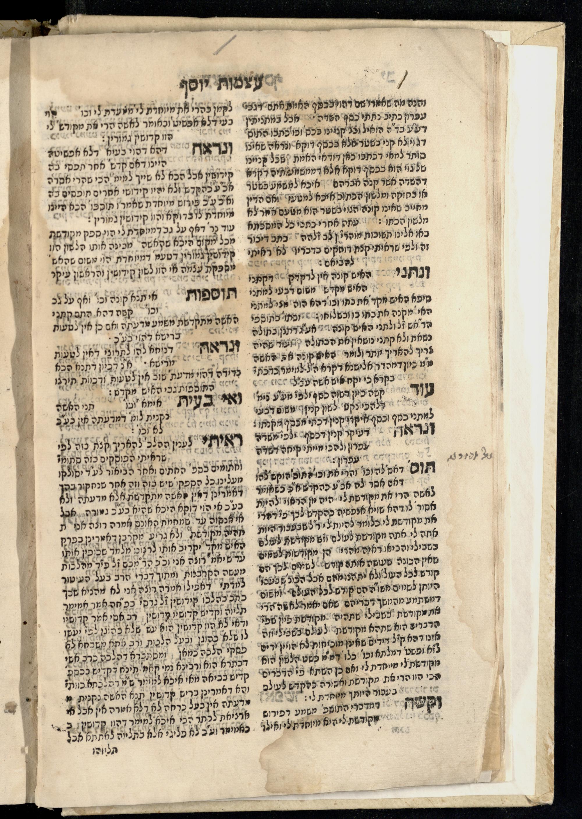 Sefer ʿAtsmot Yosef : ṿe-hu beʾur kelalim meḥudashim she-ha-Torah nidreshet ba-hem ... : gam ba ha-beʾur be-ʿiyun u-ve-filpul nimrats be-masekhet Ḳidushin mi-teḥilatah ʿad sofah ... gam ... be-sugyat Parah ṿe-Raḥel be-p. Kol ha-baśar u-ve-sof pereḳ Ketsad ha-regel ... / ḥibartiṿ ṿe-gam yisadtiṿ ani ha-tsaʿir Yosef ben Yitsḥaḳ ... n. ʿEzra ...ספר עצמות יוסף : והוא ביאור כללים מחודשים שהתורה נדרשת בהם ... : גם בא הבאור בעיון בעיון ובפלפול נמרץ במסכת קידושין מתחילתה עד סופה ... גם ... בסוגיית פרה ורחל בפ׳ כל הבשר ובסוף פרק כיצד הרגל ... / חברתיו וגם יסדתיו אני הצעיר יוסף בן יצחק ... ן׳ עזרא ...