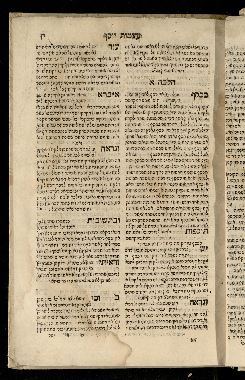 Sefer ʿAtsmot Yosef : ṿe-hu beʾur kelalim meḥudashim she-ha-Torah nidreshet ba-hem ... : gam ba ha-beʾur be-ʿiyun u-ve-filpul nimrats be-masekhet Ḳidushin mi-teḥilatah ʿad sofah ... gam ... be-sugyat Parah ṿe-Raḥel be-p. Kol ha-baśar u-ve-sof pereḳ Ketsad ha-regel ... / ḥibartiṿ ṿe-gam yisadtiṿ ani ha-tsaʿir Yosef ben Yitsḥaḳ ... n. ʿEzra ...ספר עצמות יוסף : והוא ביאור כללים מחודשים שהתורה נדרשת בהם ... : גם בא הבאור בעיון בעיון ובפלפול נמרץ במסכת קידושין מתחילתה עד סופה ... גם ... בסוגיית פרה ורחל בפ׳ כל הבשר ובסוף פרק כיצד הרגל ... / חברתיו וגם יסדתיו אני הצעיר יוסף בן יצחק ... ן׳ עזרא ...